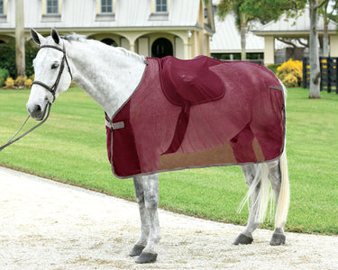 The Rider’s International™ Ringside Scrim Sheet keeps ring dust off your horse and saddle as you wait for your class to begin. Classic mesh scrim has a single front closure and a tail cord. Surcingle-free to allow easy on/off ringside. Breathable shoulder lining prevents rubbing. Generous cut ensures coverage over horse and saddle.