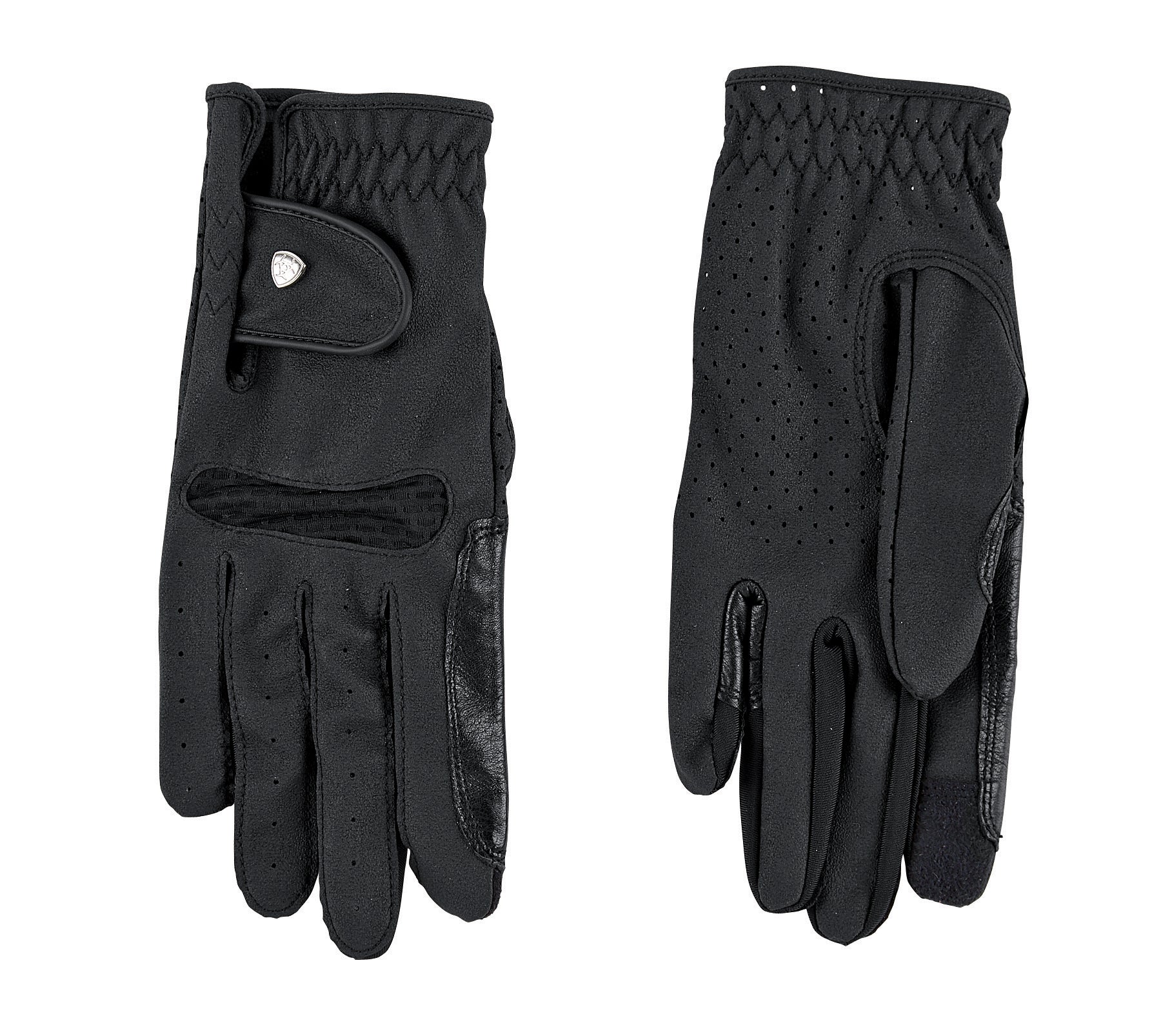 Made of technical performance fabric with UPF 50+, the Ariat® Archetype Grip Glove has a perforated palm to provide maximum breathability. Mesh knuckle inserts promote additional airflow, while sheepskin reinforced stress points let this glove stand up to use. Touchscreen compatible. Adjustable Velcro® closure with Ariat logo detail. In classic black.