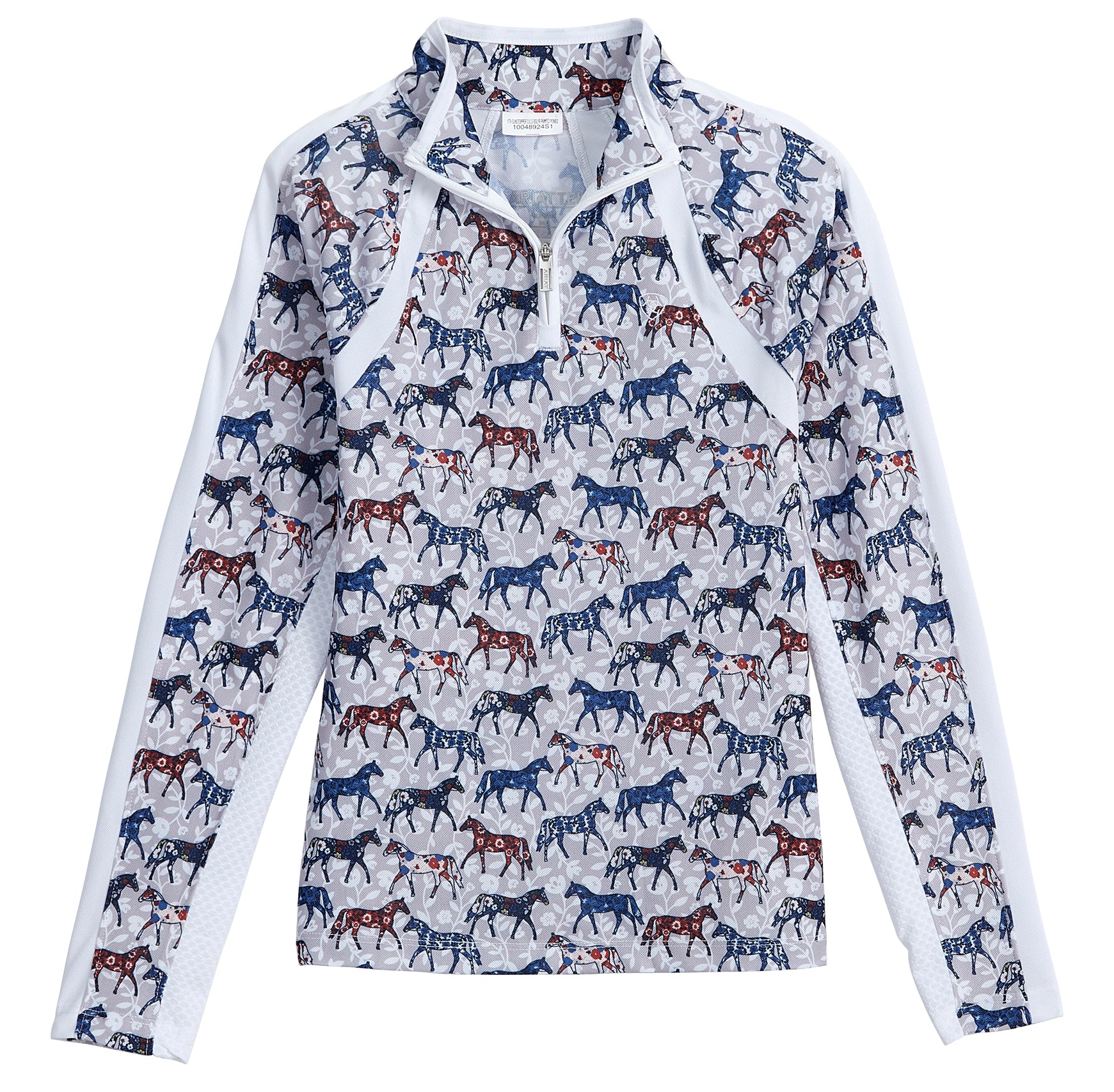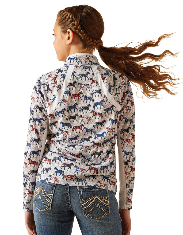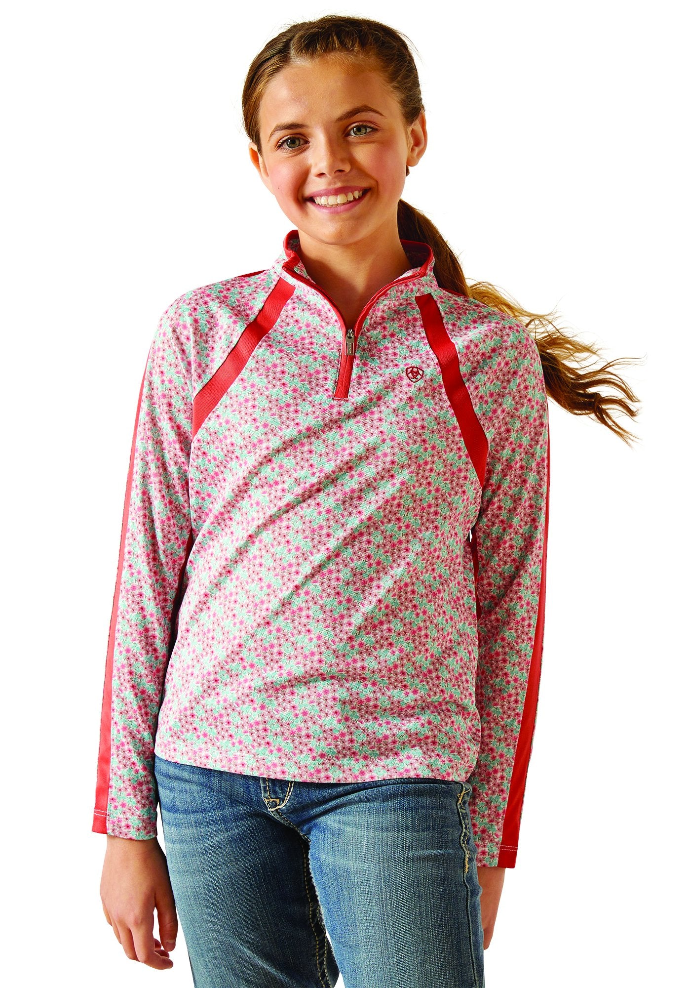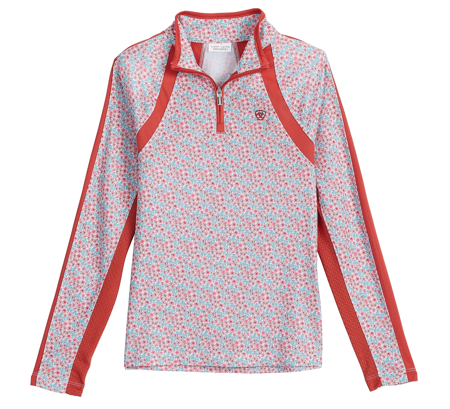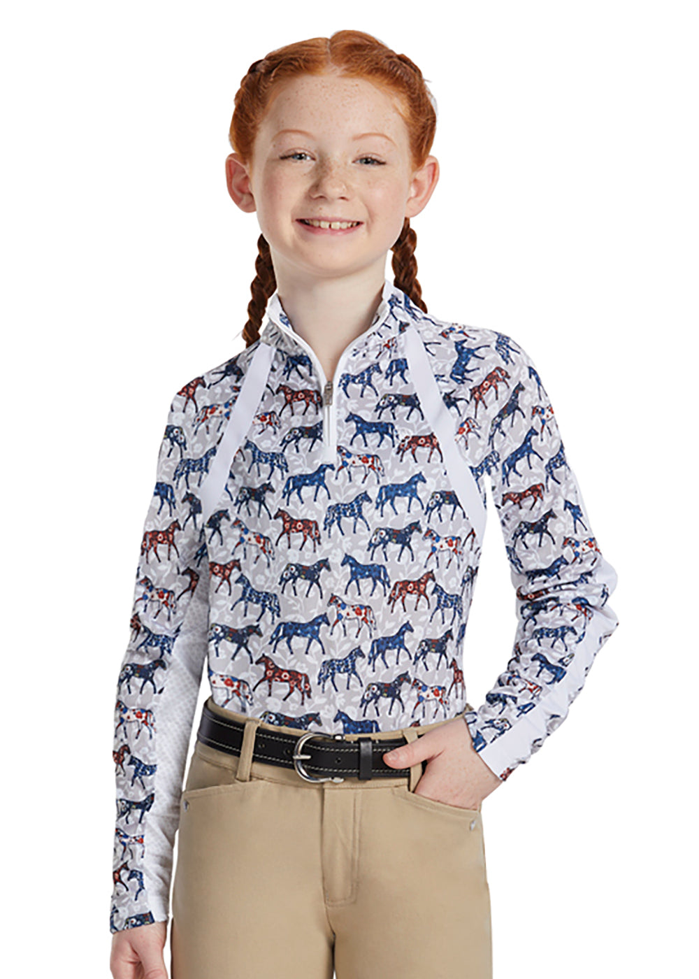 The Ariat® Kids’ Print Sunstopper Shirt 3.0 is a quarter-zip base layer riders can feel extra good about wearing! This updated version of a perennial favorite is made with a lightweight, recycled poly piqué knit in a lively print. Rated UPF 50, it helps shield skin from the sun. ClimateTek™ cooling technology and FreshTEK™ odor resistant technology work together to keep kids feeling fresh.