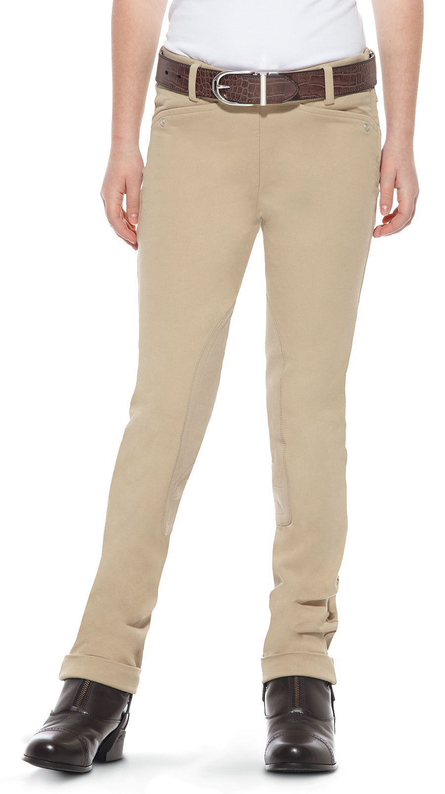 Ariat® Kids' Heritage Side-Zip Jods offer just the right look for competition. Breathable, four-way stretch cotton twill with European slim fit with a modified low rise. Synthetic suede knee patches, stylized front pockets, belt loops. V3® waist.