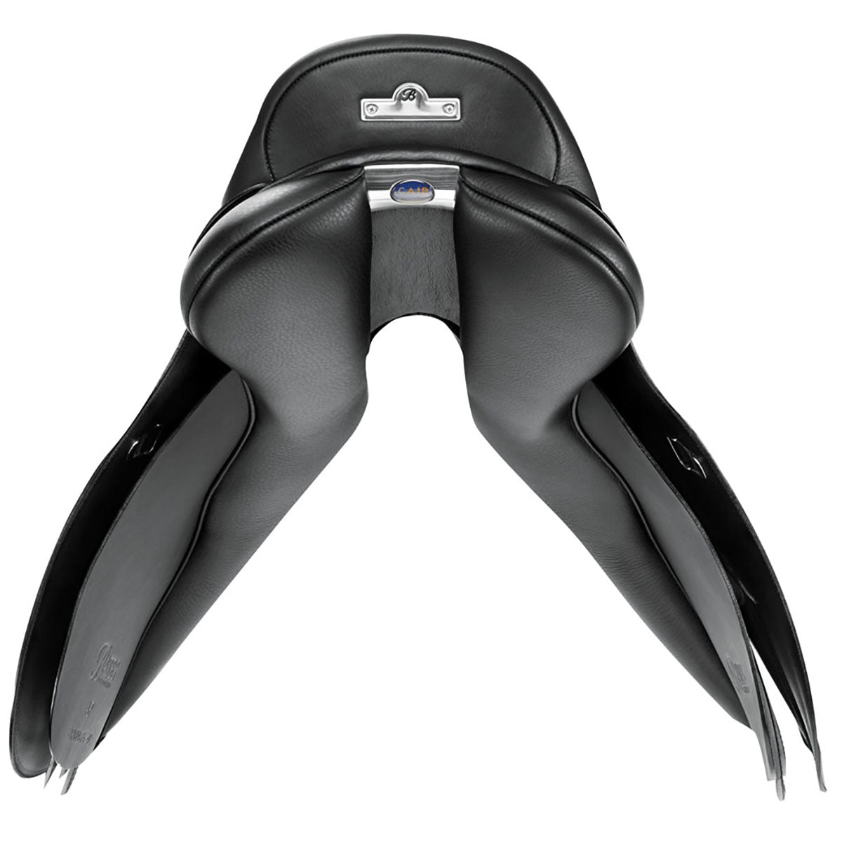 The ergonomic stirrup bar enables the roller of the tongue of the stirrup leather buckle to be recessed into the bar and sit flush, which significantly reduces the bulk under your leg. The point and balance strap girthing system achieves greater strength and durability and improves the distribution of pull from the front and back of the saddle to increase comfort and saddle stability.