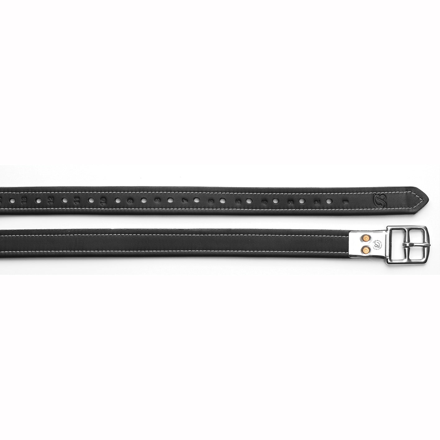 Bates Stirrup Leathers with Contrast Stitching complement perfectly the Bates Hunter Jumper saddle and Bates Elevation saddle range. Made of high-quality Bates leather, these elegant stirrup leathers feature a riveted buckle to reduce the thickness under your leg. A webbing core ensures that the leathers will not stretch and cause unevenness. Holes are spaced at 1" intervals. Pair.