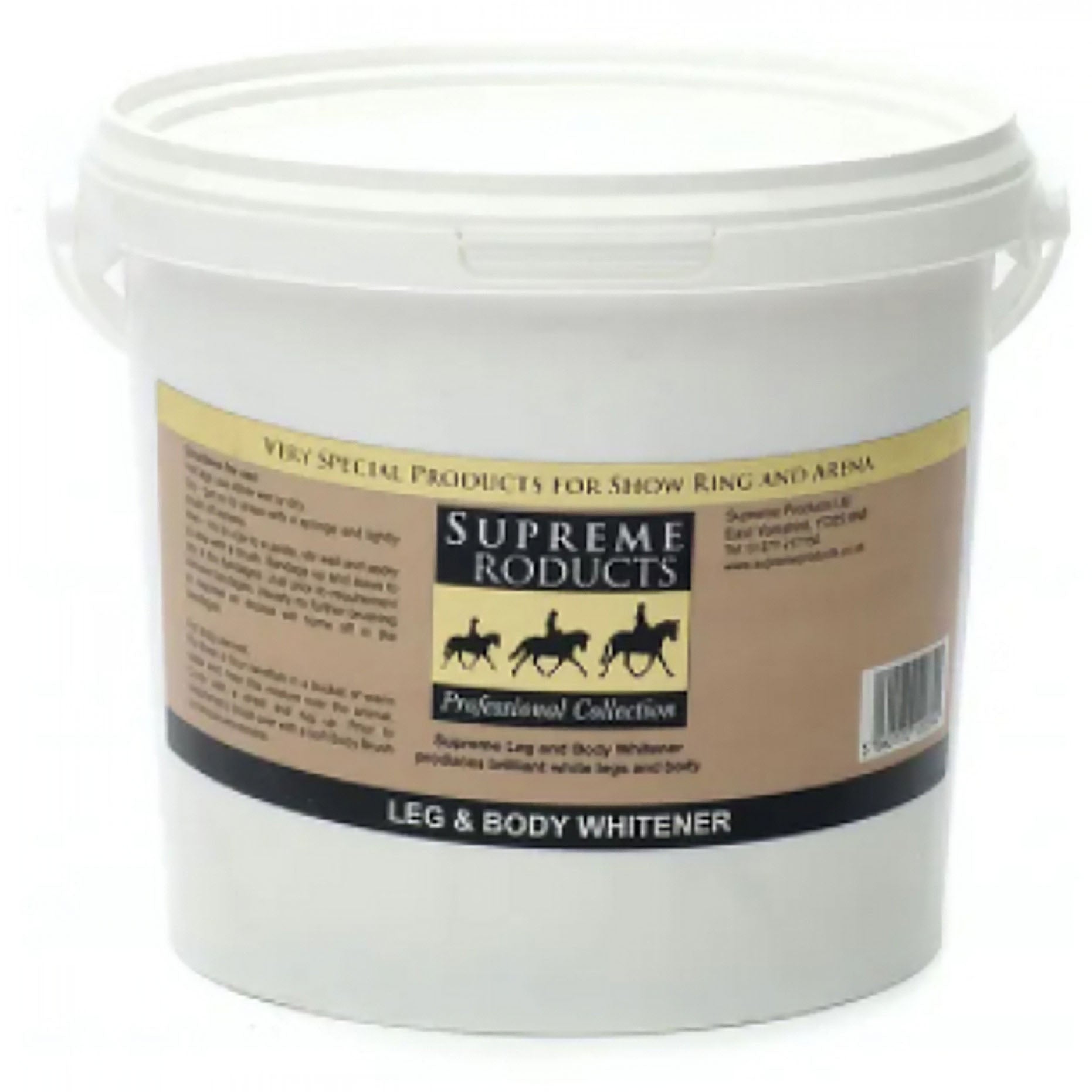 Supreme Products Leg & Body Whitener for horses produces brilliantly white legs and body. Easy to apply wet or dry, it is a concentrated formula that mixes with water to the consistency of yogurt to produce extremely white legs. It can be used to cover last-minute stains from manure and urine or added to final rinsing water and rinsed over the horse to whiten the body, mane and tail.