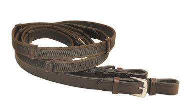 From Tory Leather Company, these 3/4" x 54" Rubber Web Reins have bridle leather ends and leather hand stops. Stainless steel buckles at center and bit ends.