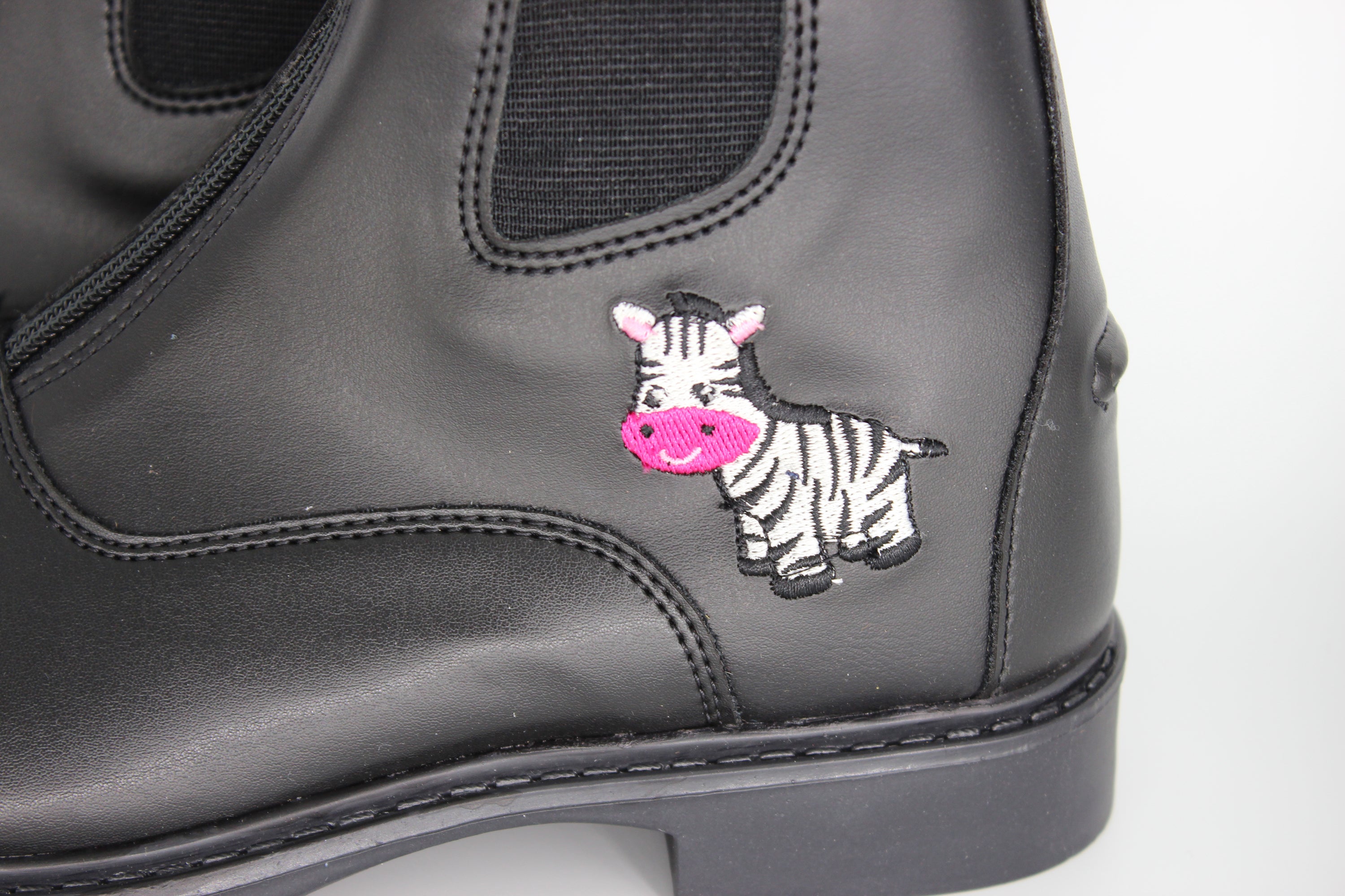 The popular TuffRider® Starter Front-Zip Paddock Boot with an adorable twist! The Children’s Zebra Front-Zip Paddock Boot has great riding features: riding heel, side elastic gussets for ankle flexion, rear spur rest, easy-on zipper and classic punched toe cap. A charming zebra embroidered detail makes this boot a fun addition to summer pony camps or lesson programs. The synthetic leather upper and rubber outsole ensure water-resistance, durability and easy care.
