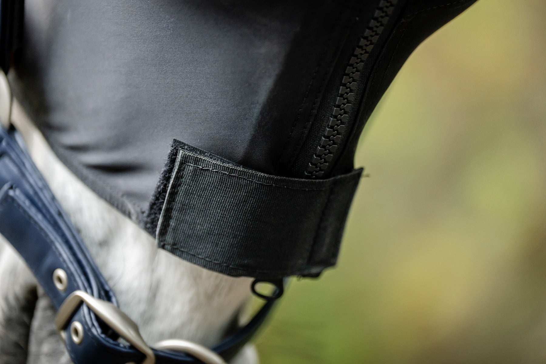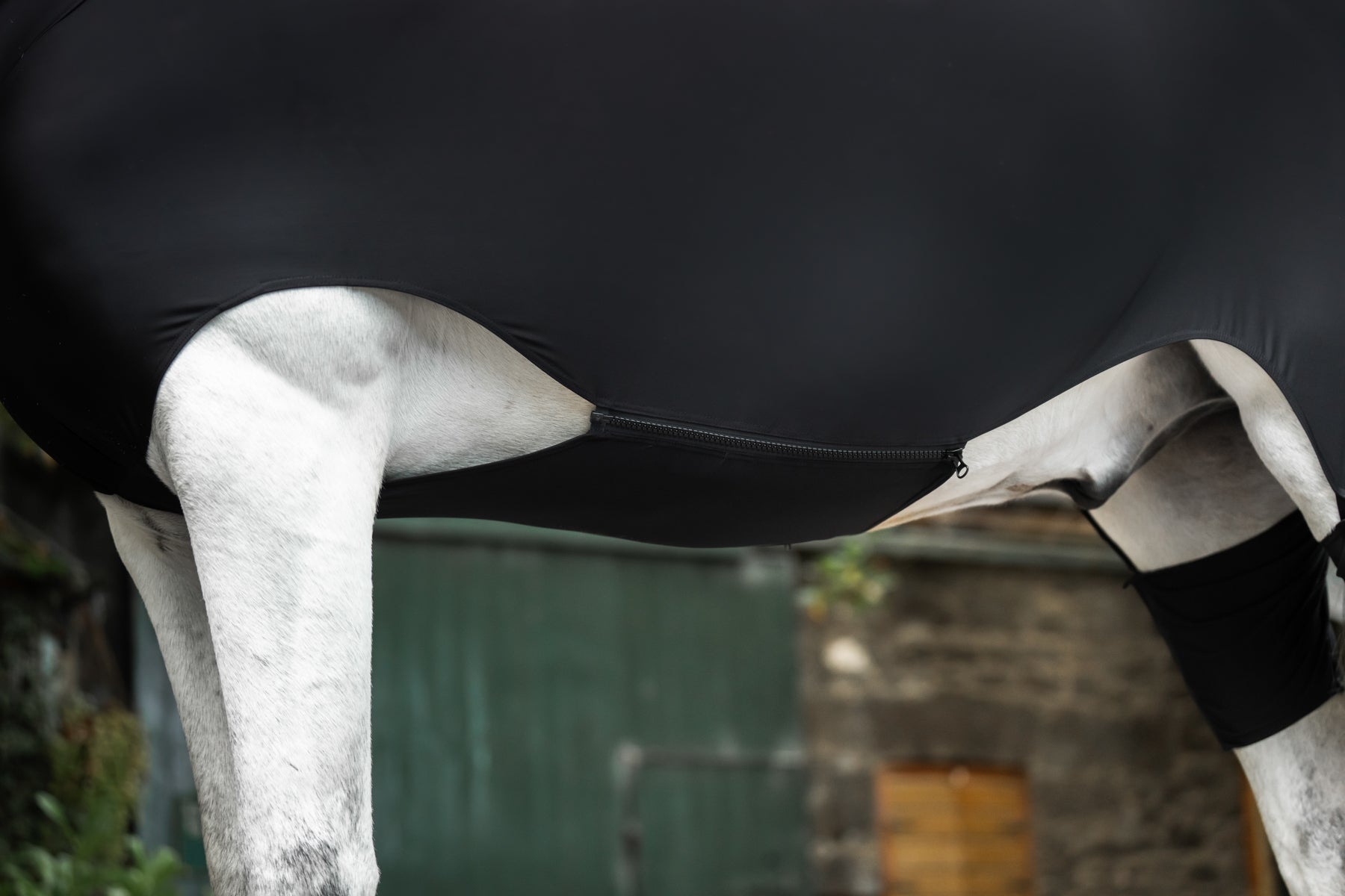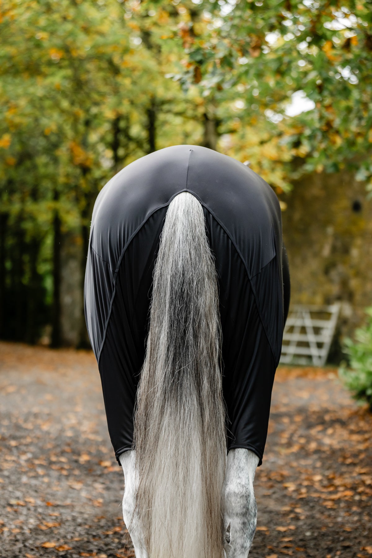 Keep your show ring shine all day long with the Horseware® Ireland Rambo® Slinky Full Body. Made from shine boosting Lycra with an anti-static treatment for a smooth and glossy coat. Contoured fit with full body coverage including face, neck, belly, hind quarters and stifle area with front and back leg arches for comfort and feedom of movement. Easy to use zip system with reinforced zip guard for face, neck, under chest and belly flap with a simple Velcro closure for the hind legs.