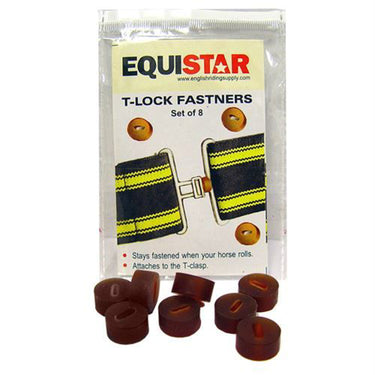 EquiStar™ T-Lock Fasteners help the surcingles of your horse’s sheets and blankets stay fastened. The gum rubber loops slip over the “T” portion of surcingle closures to help prevent accidental release. Environmentally friendly; engineered with materials that pass REACH’s strict standards. 8 per package.