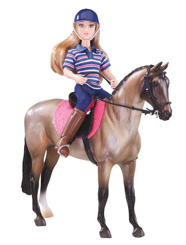 The Breyer® Classics® English Horse and Rider set features a lovely English rider dressed casually for a lesson on her beautiful bay roan horse. Includes 6" articulated rider, model horse, saddle pad, English saddle and bridle. 1:12 scale. Horse is approximately 9"L x 6"H. For ages 4+.