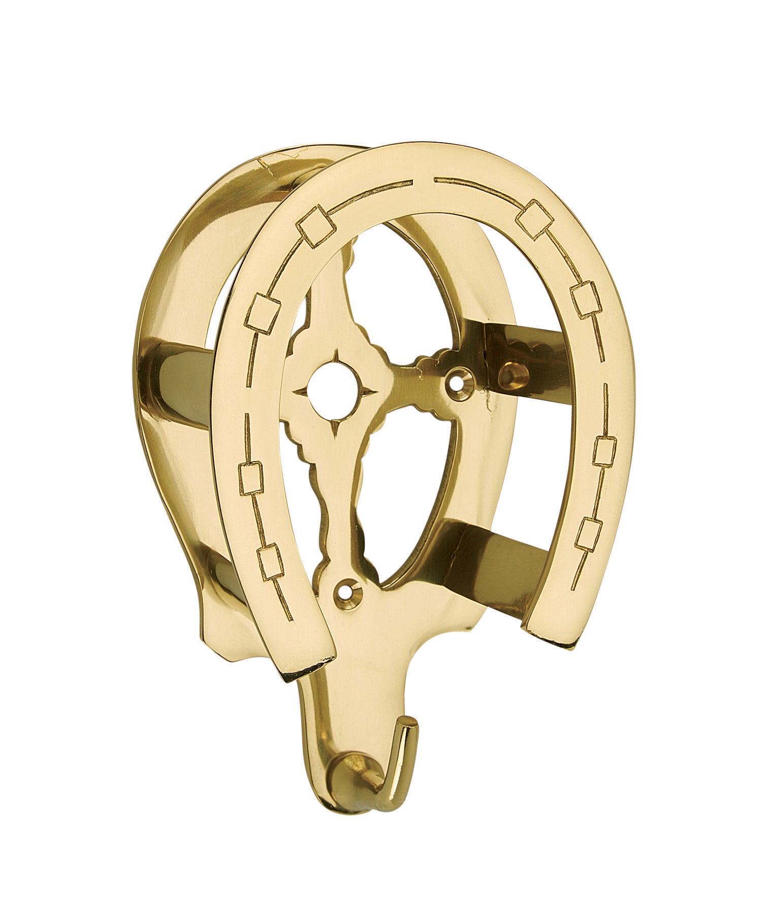 The DS Horseshoe Bridle Bracket is made of solid brass to provide durability and long-lasting good looks. It adds a touch of elegance as well as useful storage to your tack room and mounts easily to any wall. This unique bridle bracket has a curved top to help maintain the shape of your bridle's crown. A convenient hook holds reins or other items. Mounting screws included.