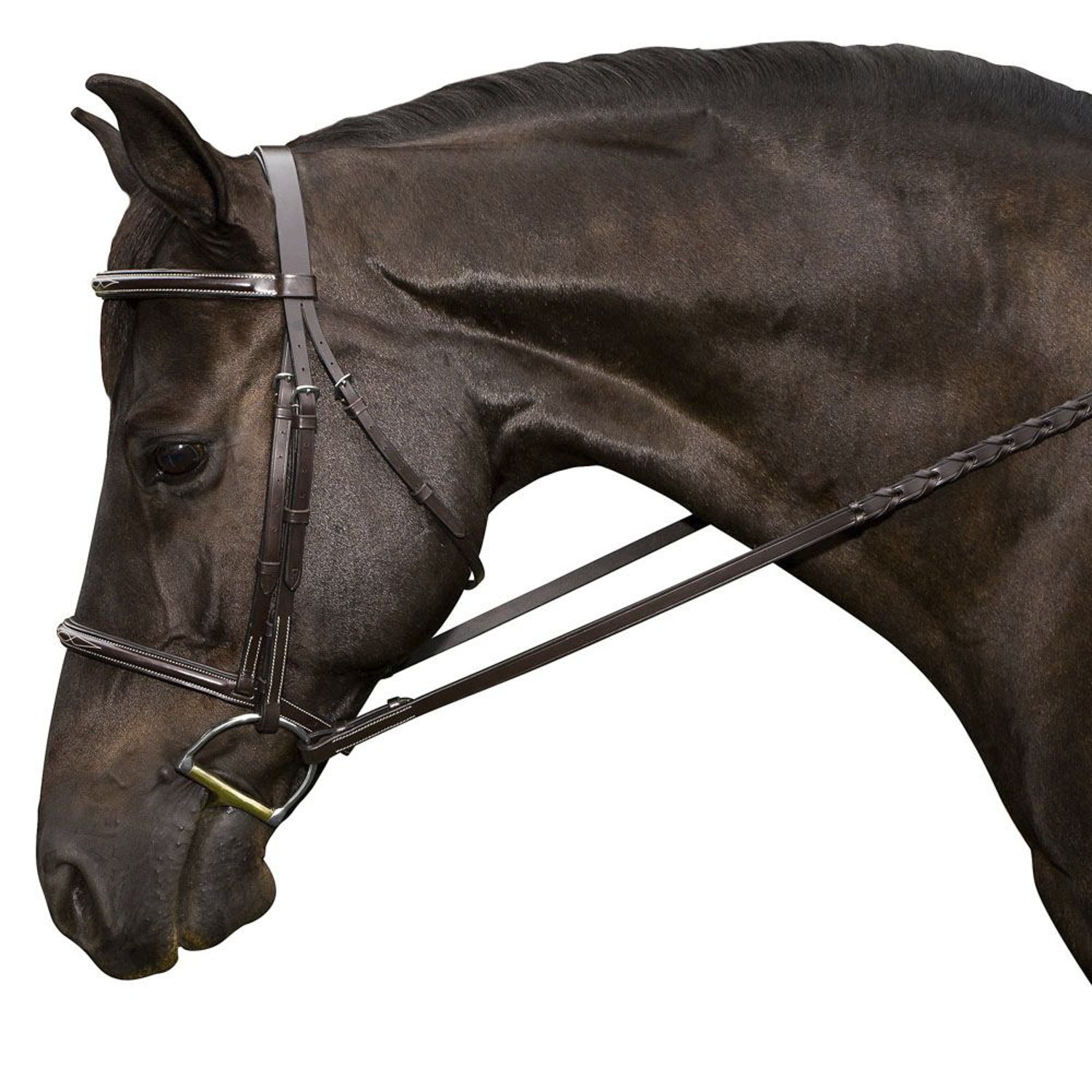The Flex Rider Fancy-Stitched Raised Snaffle Bridle is made from quality leather in chocolate. Raised panels are enhanced with fancy stitching. Plain flat laced reins are included.