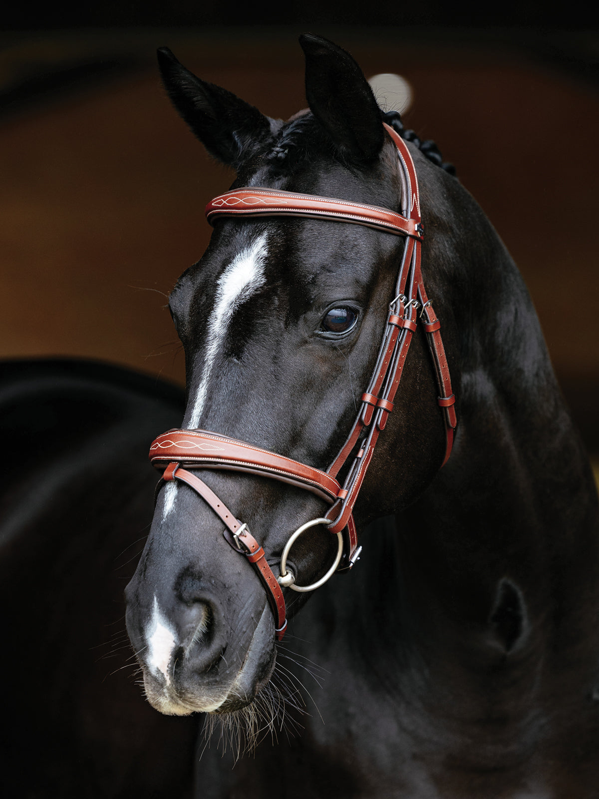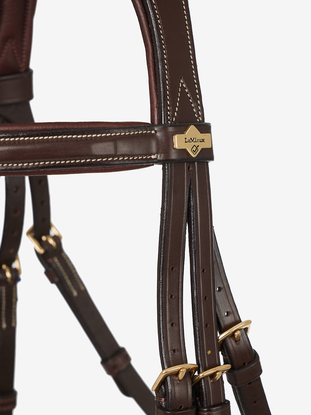 The elegant padded and tapered brow and nose are accented with a decorative contrast stitching. A discreet, detachable flash loop sits flush within the noseband and is easy to remove if a flash is not needed. The flash strap boasts a roller buckle with a protective leather buckle guard behind.