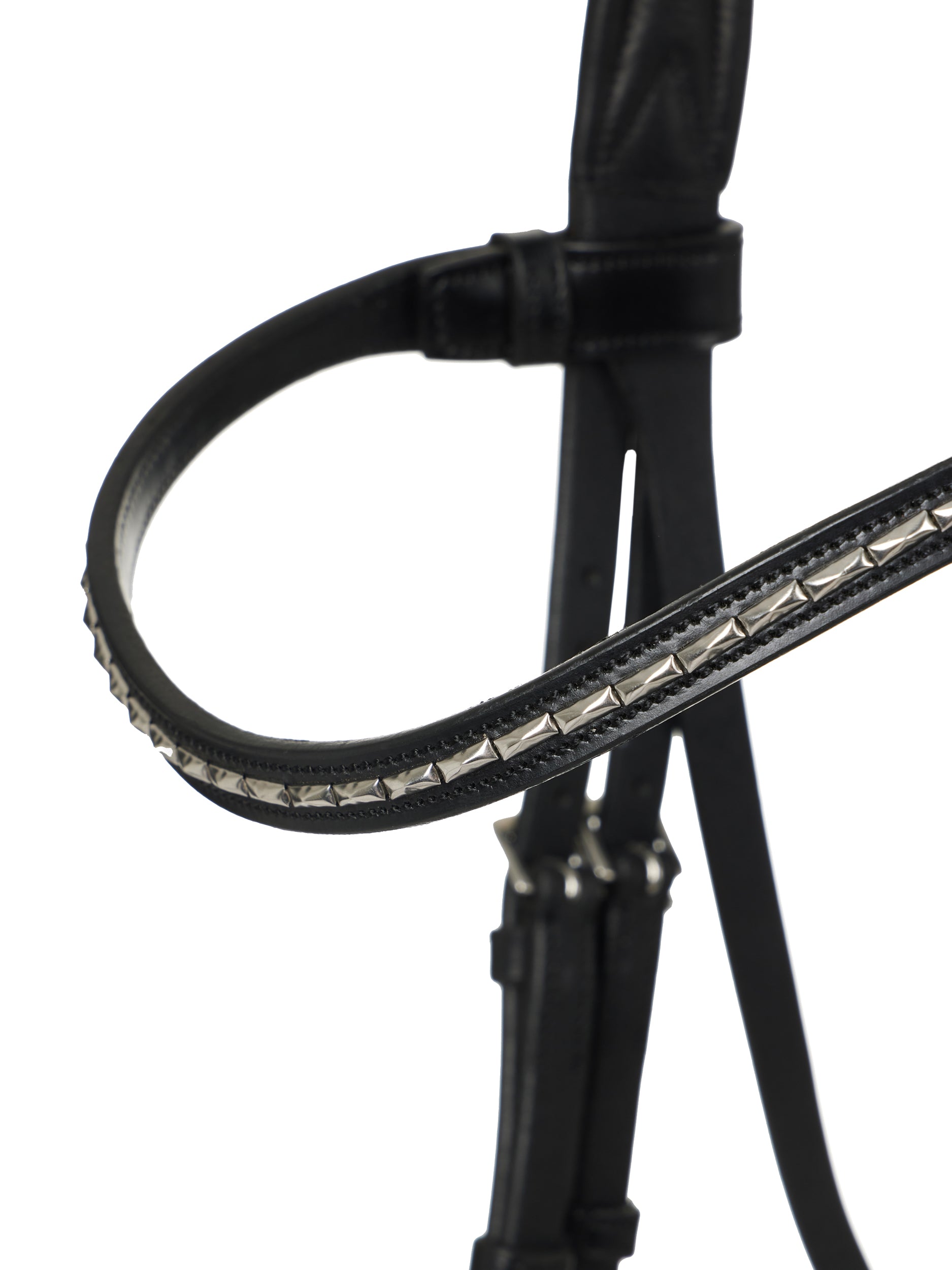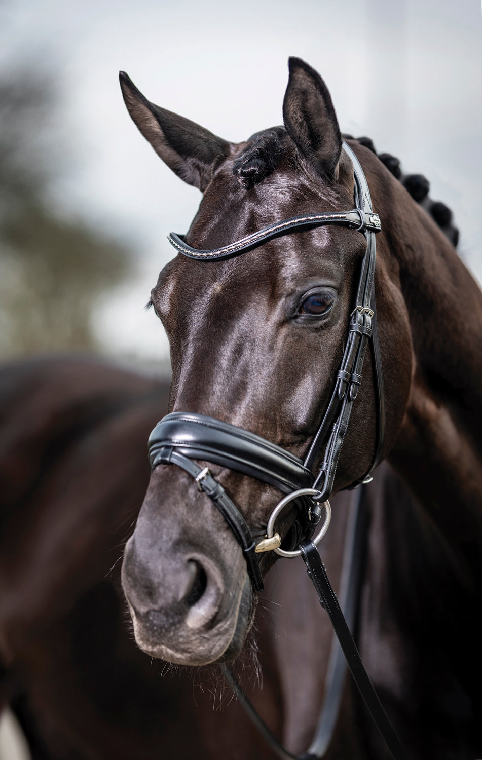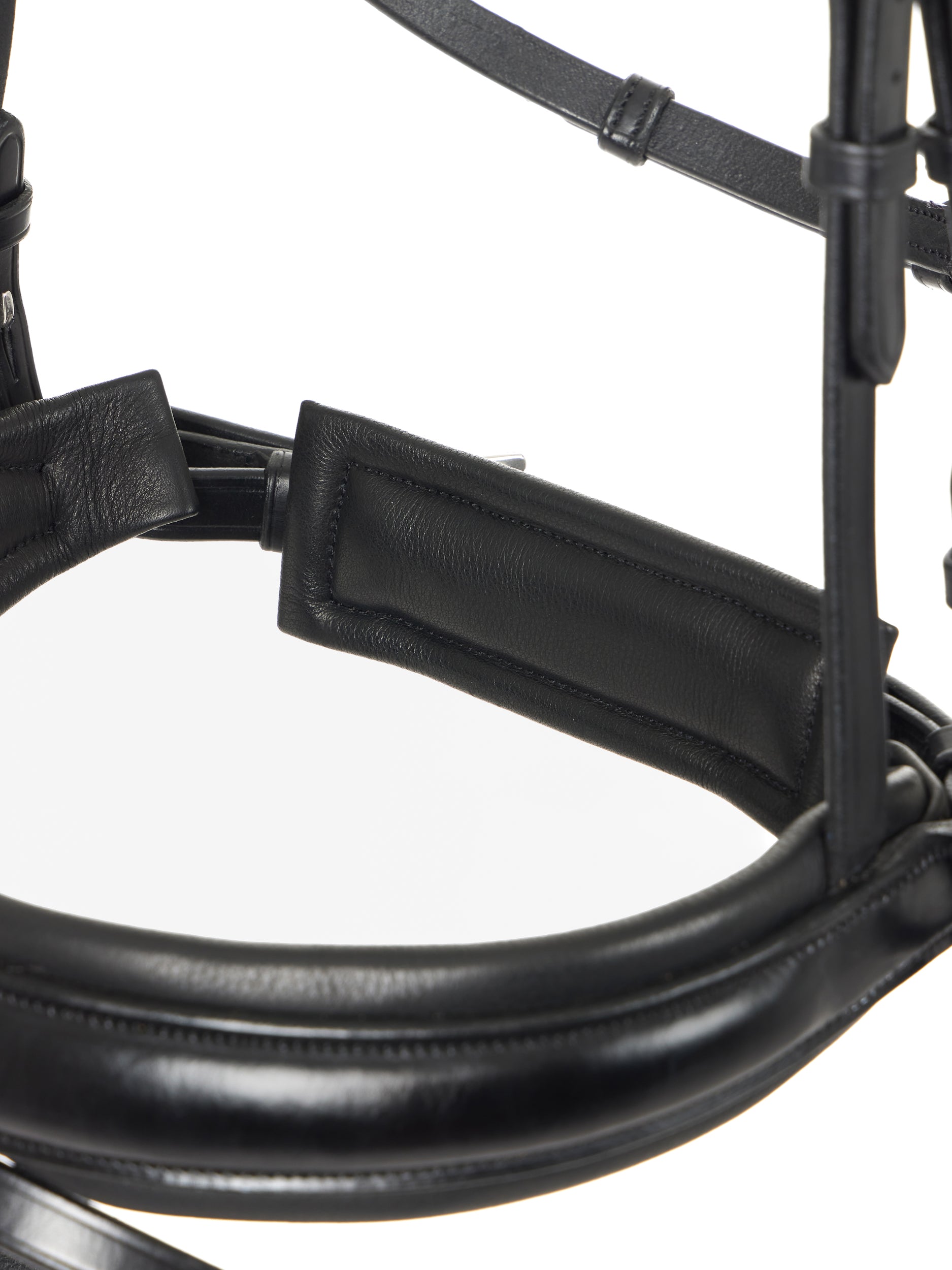 The delicate, beautifully sculpted clincher browband is easily detachable with popper closures. The statement crank noseband is fully cushioned and equipped with a roller buckle, as is the flash strap. Throatlatch secures discreetly with one buckle under the jaw.