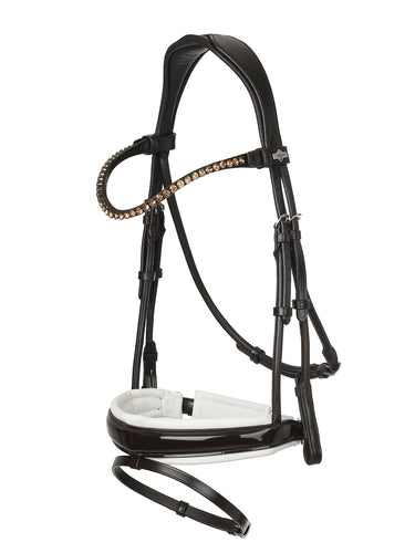 Contoured, padded and crystal-embellished browband exudes sophistication and comfort. Patent leather padded crank noseband has roller buckles and a detachable flash.
