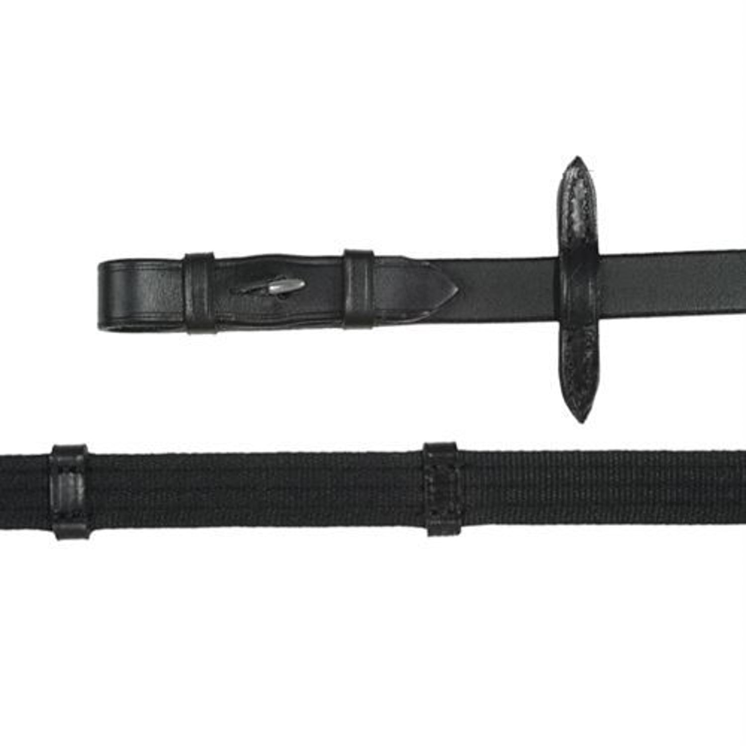 Otto Schumacher Web Reins with hook stud ends and hand stops deliver quality and grip. They are handcrafted in Germany from webbing that is finished with leather fronts and leather hand stops. Stainless steel hardware. Black, in two widths.
