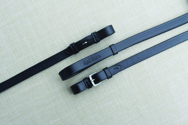 Red Barn 5/8" x 56" Curb Reins are made of supple English leather. Sewn center and hook stud ends.