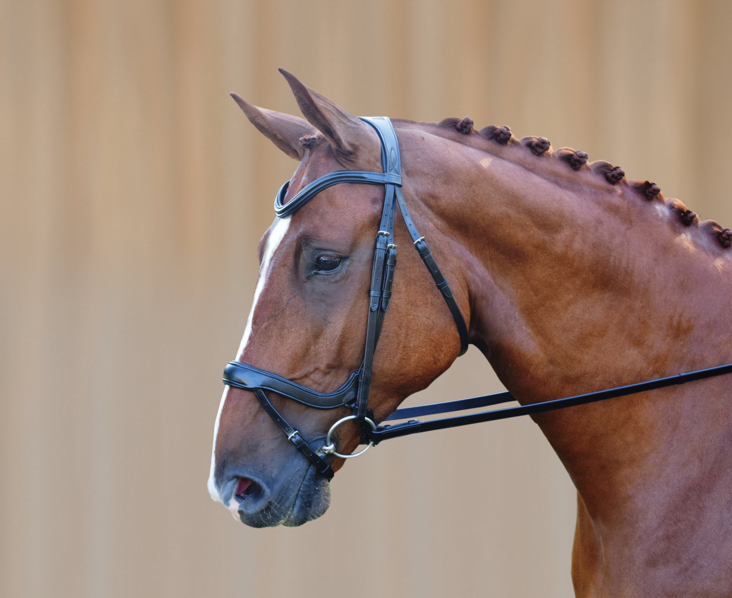 This exquisite Red Barn Arena Ergonomic Snaffle has been handcrafted in the finest English leather. This is a well-made and durable bridle that features an ergonomic, well-padded noseband and a waved, soft browband for comfort. The beautiful, ergonomic headstall is soft and padded for comfort with decorative stitching on each side just above the browband. Reins are sold separately.