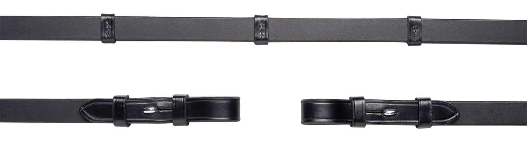 Schockemöhle Leather Reins with Hand Stops are a beautiful, durable choice in quality leather with hook stud ends. Black.