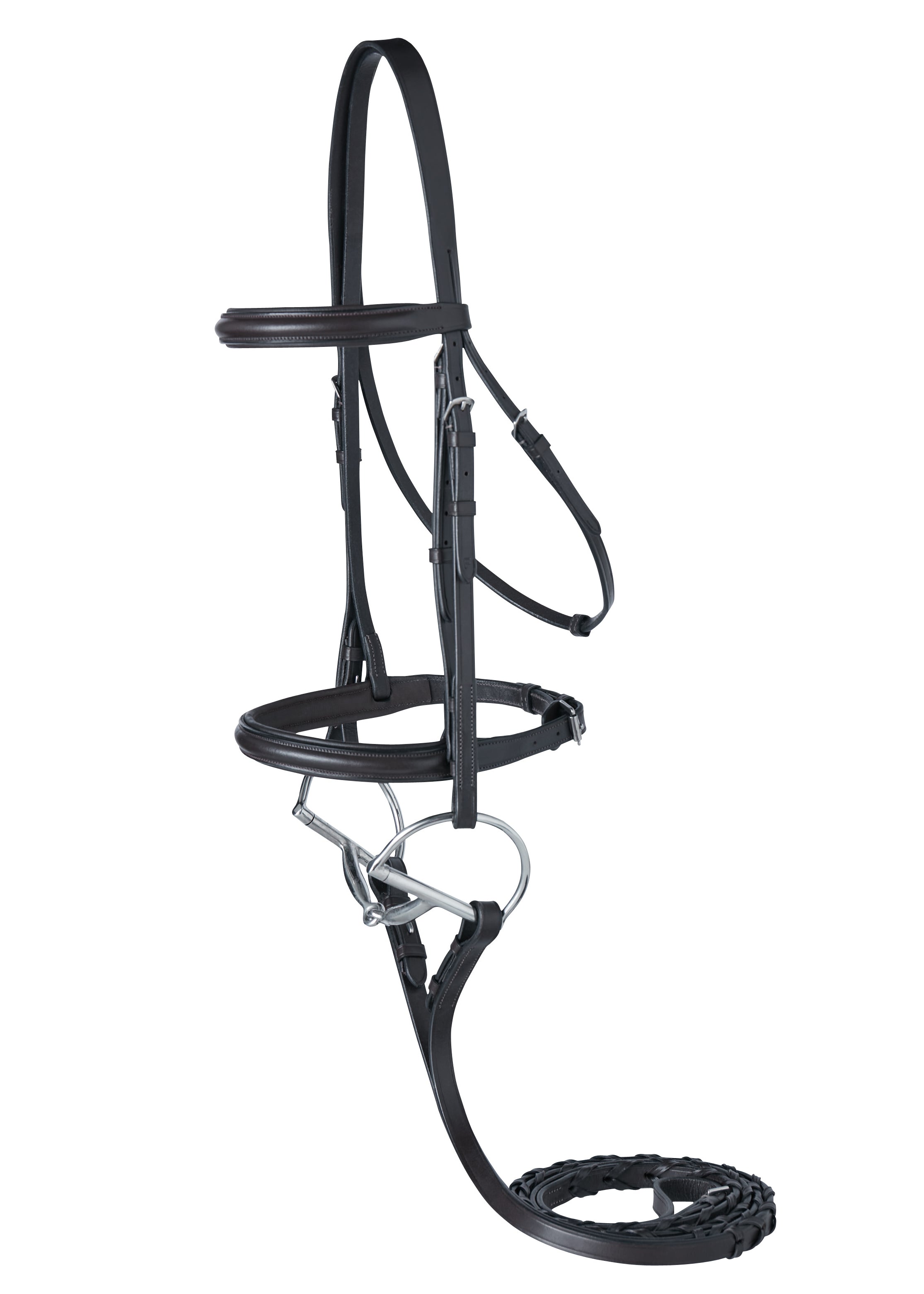 The Suffolk™ Hunter Fancy-Stitched Bridle with laced reins is attractive enough for shows and durable enough for schooling. Offering unprecedented quality at a great price, this timeless bridle comes in rich brown leather with a fancy-stitched browband and noseband. Hook stud ends.