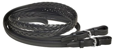 These Tory 5/8" x 60" Five-Plait Braided English Reins have stainless steel buckle bit ends and a center buckle. Fine lacing in the grip area.