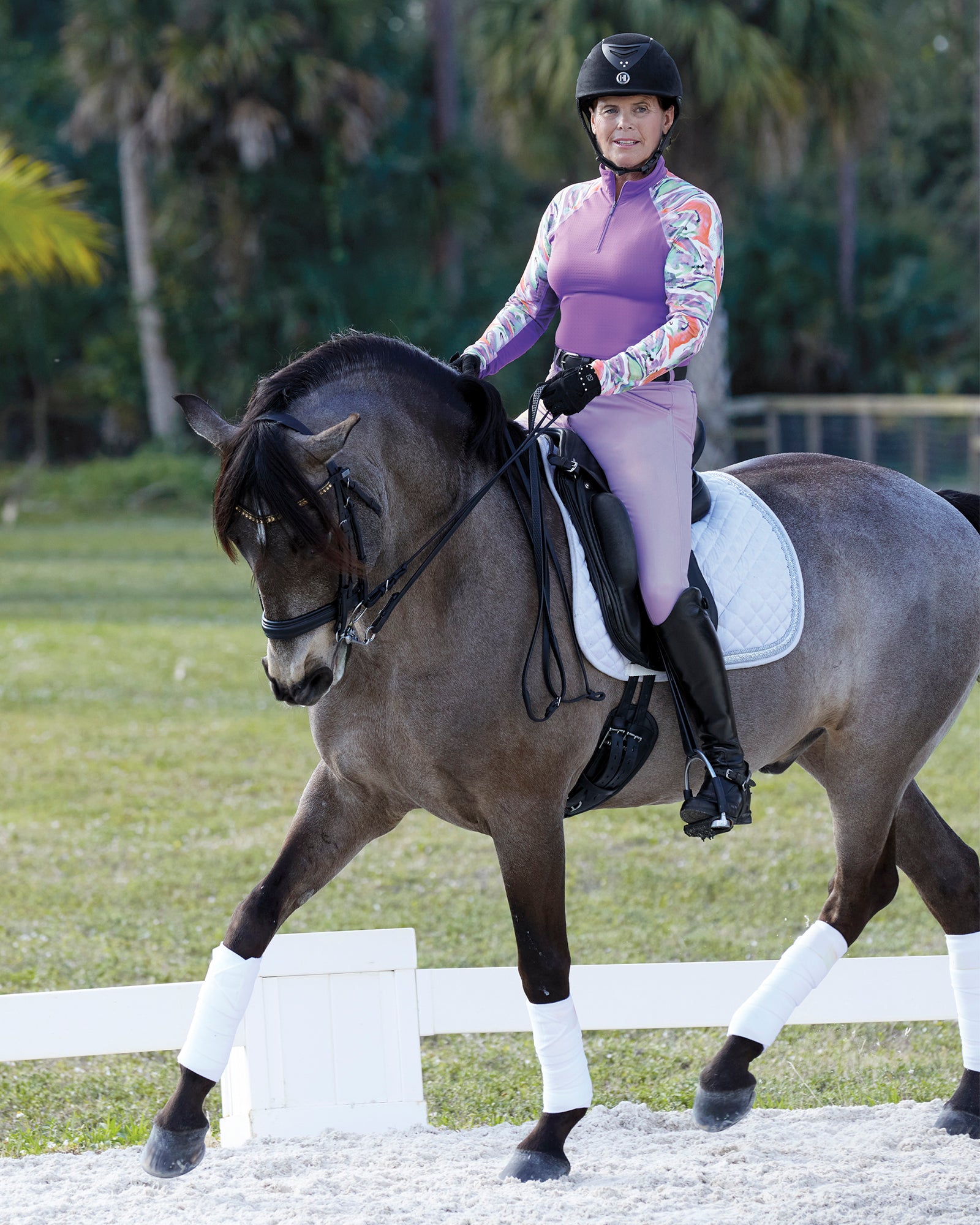 Our CoolBlast® 100 Ladies’ LaBelle Print Long Sleeve Shirt features a beautiful watercolor design on the sleeves and collar. Constructed with raglan sleeves, it offers athletically inspired freedom of movement at the shoulders. Our superior cooling fabric makes this riding top ideal on sunny days as it provides UPF 100, blocking 99.89% UVA and 99.93% UVB rays to shield your skin.