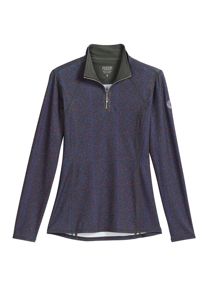 This top is styled with a softly lined mock neck, quarter zipper and slightly dropped hem for coverage. Stitch lines flatter your form. Brand embroidery details one sleeve.