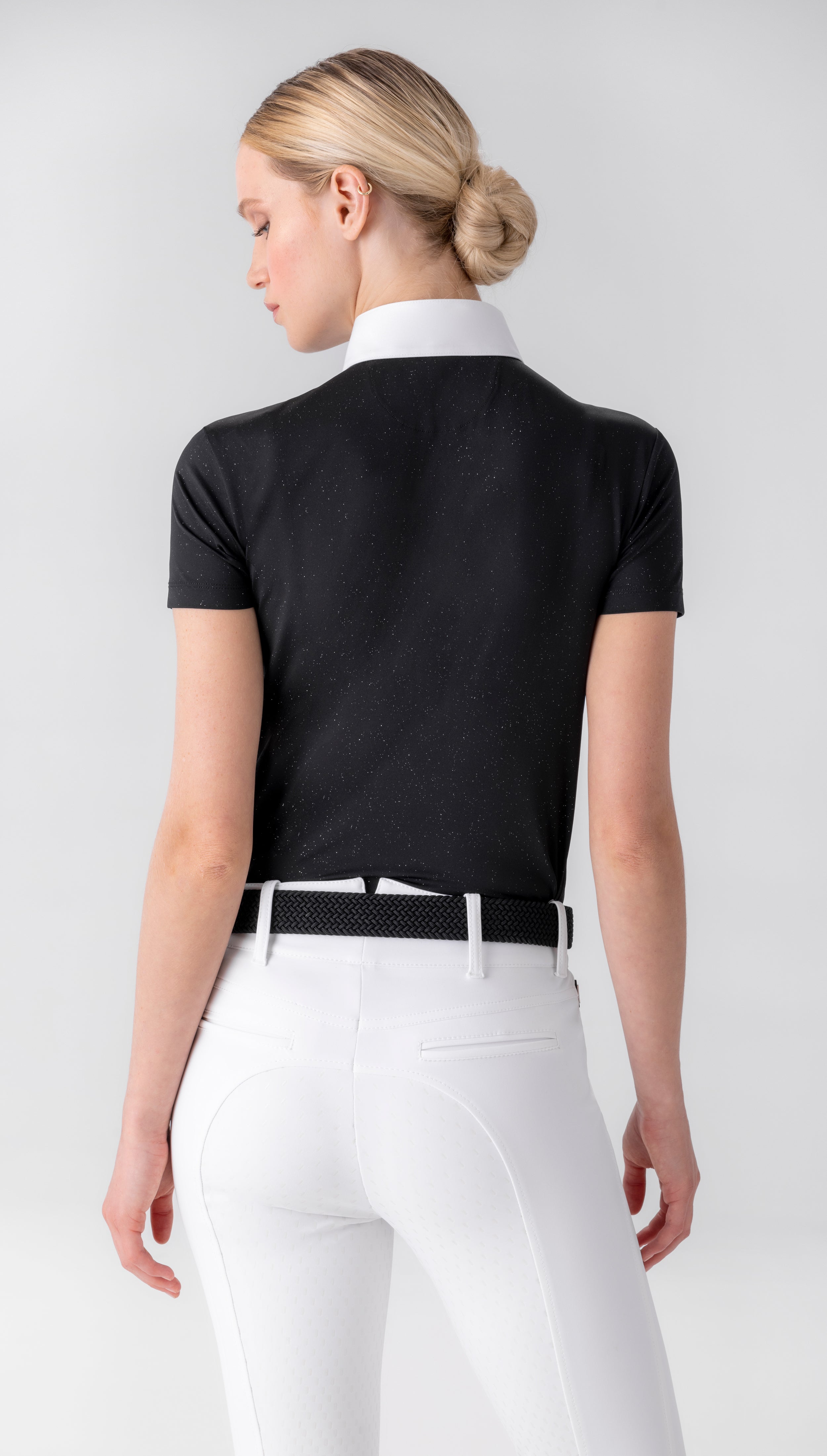The Equiline Gliteg Competition Polo Shirt has a touch of fashionable glitter on the collar. High-performance fabric with extra stretch offers breathability and quick-dry comfort. Flattering and athletic, half-zip placket.