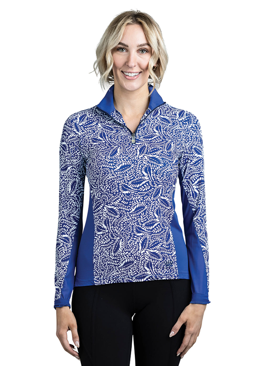 Kastel Denmark Jill Long Sleeve Blue Leaves Shirt features a contemporary foliage print in seasonless royal blue and white. Chevron stripes accents the chest and sleeves as an athletic touch.