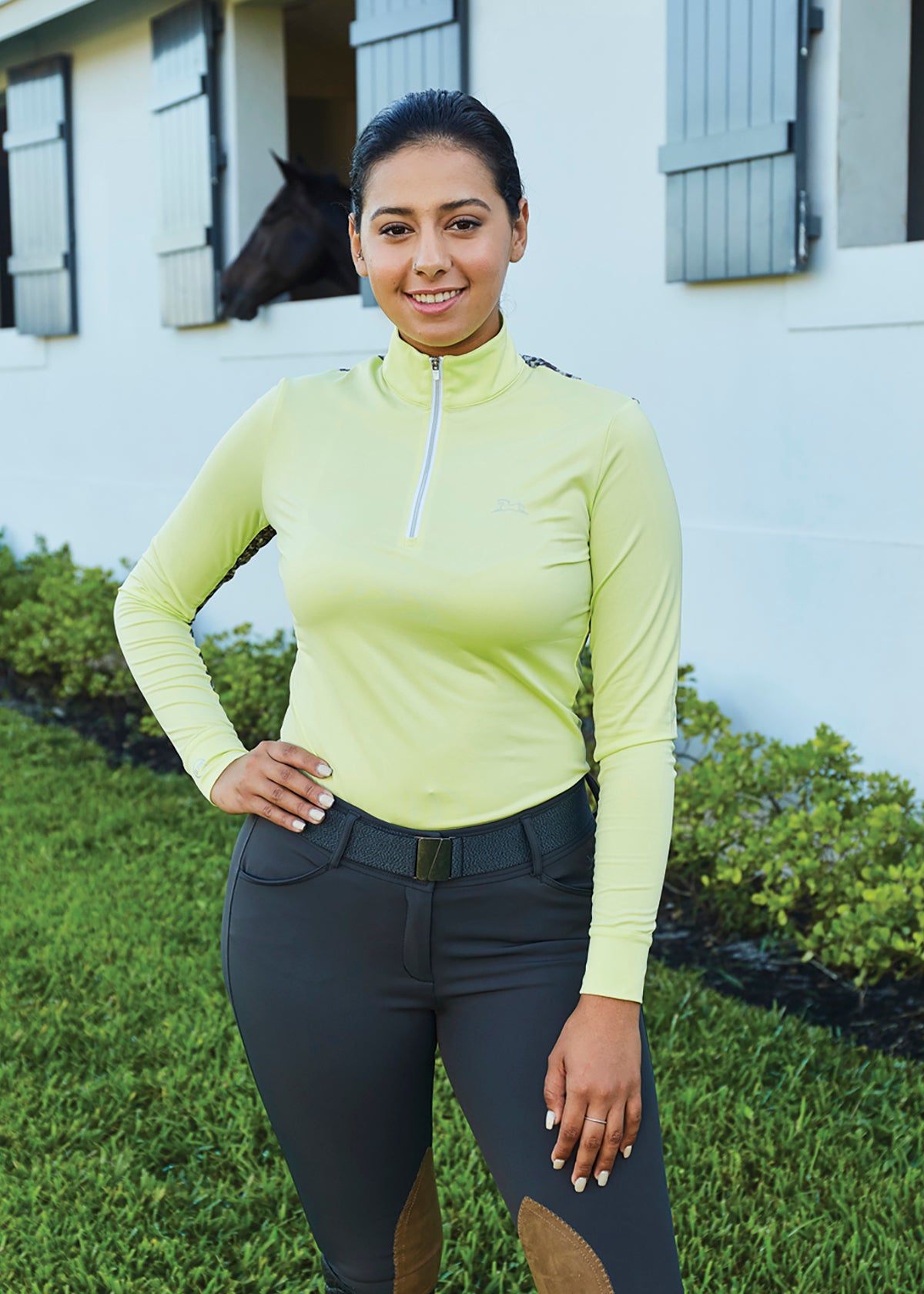 The R.J. Classics Ladies’ Ella 37.5® Long Sleeve Training Shirt is a classic schooling shirt with modern twist. It is updated with patented 37.5 thermoregulation technology, proven to help your body manage its core temperature and therefore, increase stamina. It keeps you comfortable by helping your body to maintain an optimum core temperature of 37.5° Celsius (99.5° Fahrenheit) which is ideal for peak athletic performance. The particles in the fabric are naturally derived and work for the life of the shirt (it will never wash out).