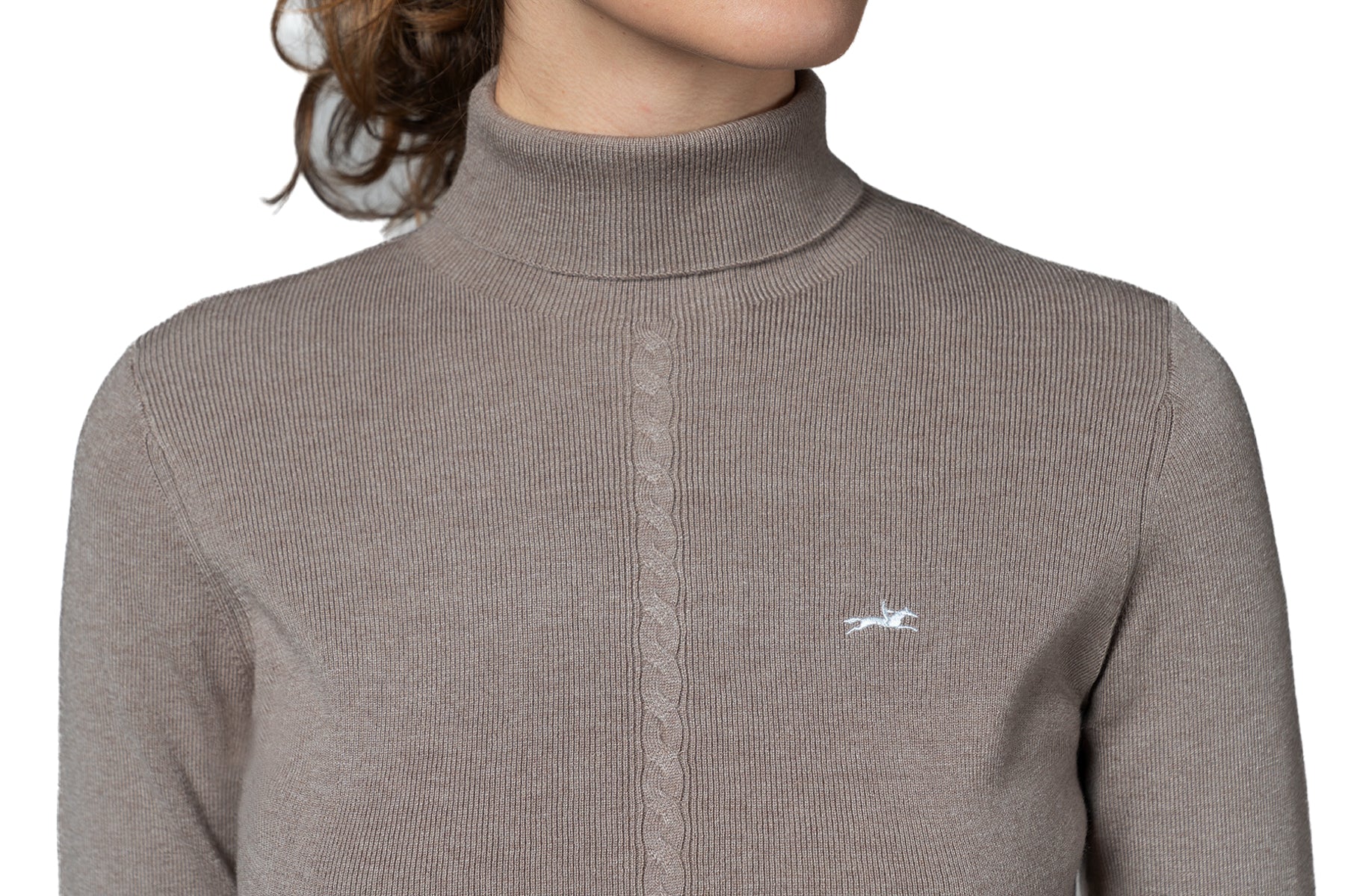 The Schockemöhle SpJosie Sweater features a classic turtleneck style with an elegant cable knit pattern down the front center. With full-length sleeves, it offers a comfortable fit and cozy warmth. A delicate horse logo embroidery on the chest completes the stylish design, making this sweater the perfect choice for discerning riders.