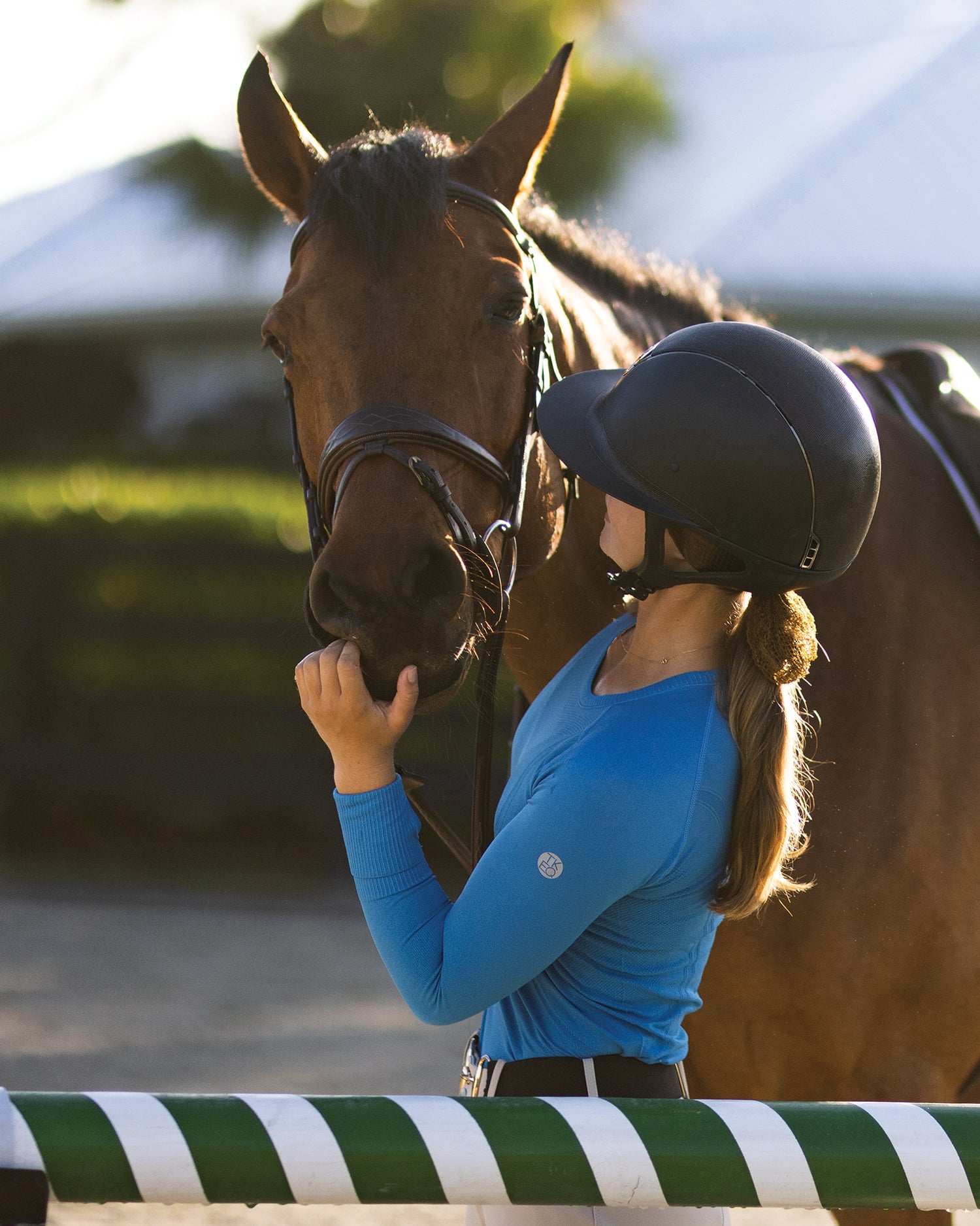 Full coverage, four-way stretch and moisture wicking make the TKEQ Kennedy Seamless Long Sleeve Top an equestrian essential. In a comfortable, flattering, seamless body design, this ultimate training shirt also provides breathability and helps block UV rays.