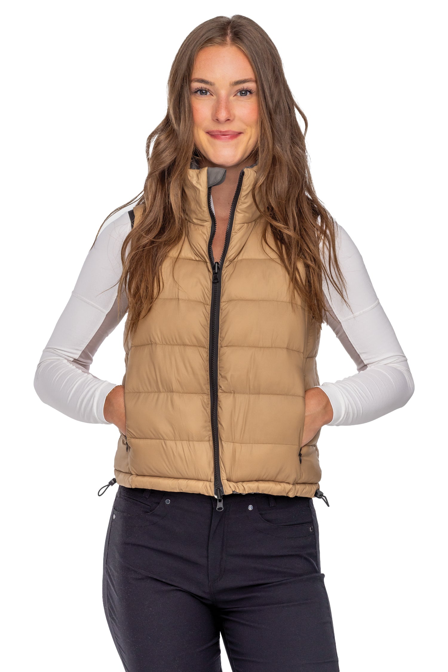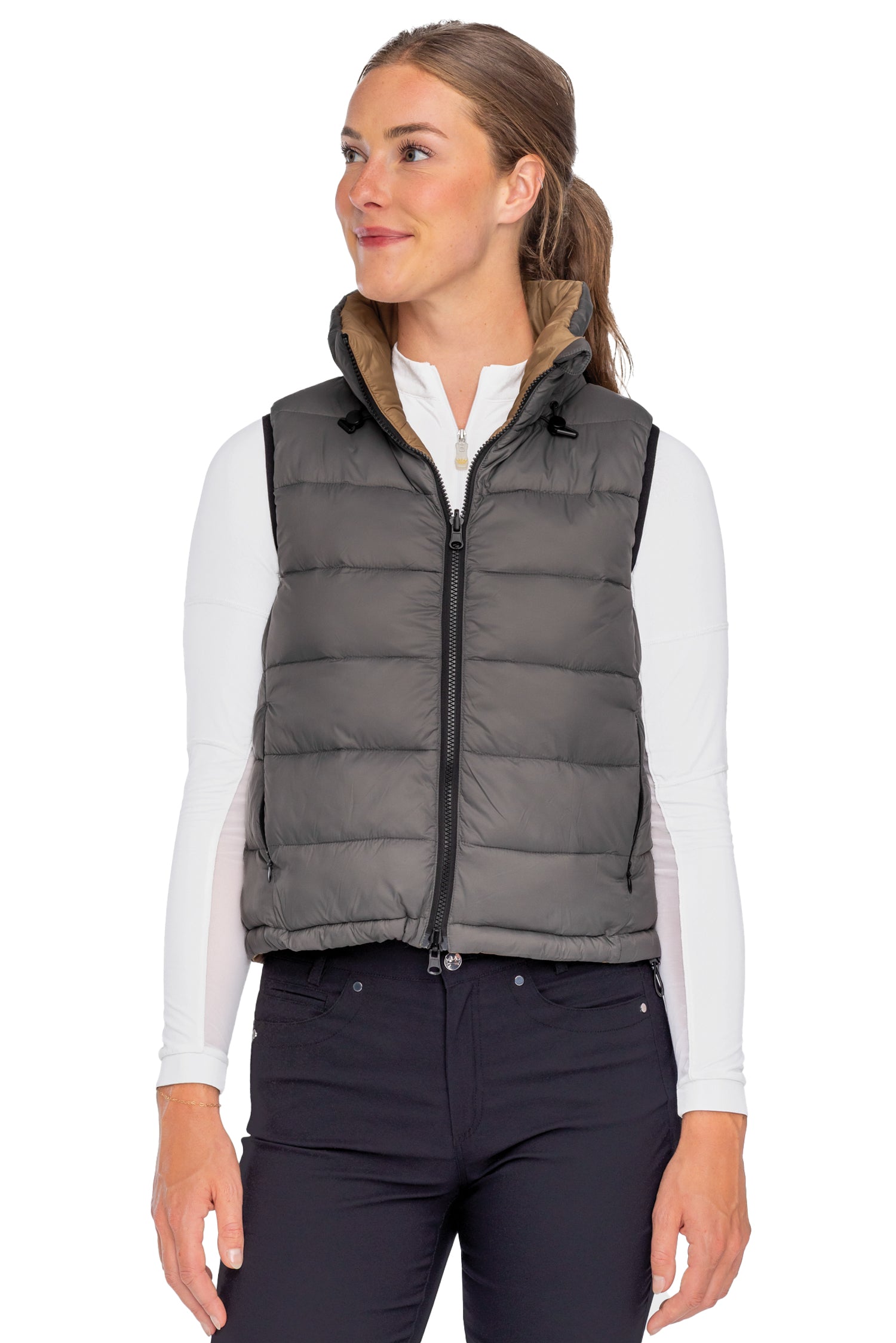 This season’s puffer vest, the Kastel Contessa Reversible Quilted Vest, is the best two-in-one for all your athletic endeavors. Sophisticated colors will welcome you into the fall season. Accented with black hardware and black piping, the vest features two independent zipper pockets, two-way main zipper and cozy, warm fiber fill.
