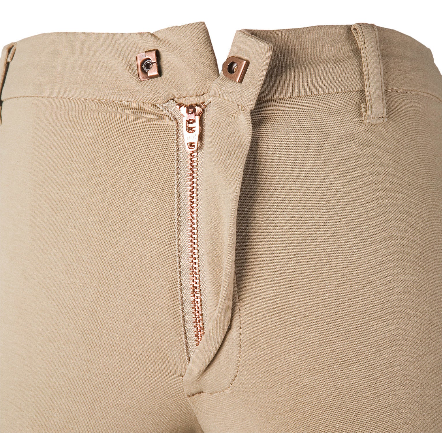 Support and recovery properties in the fabric and a contoured design around seat and knee eliminate unsightly bagging to maintain a neat appearance. Clarino™ knee patches, cuffed hems, plush, elastic waistband with belt loops, brass front zipper. Includes jod straps.