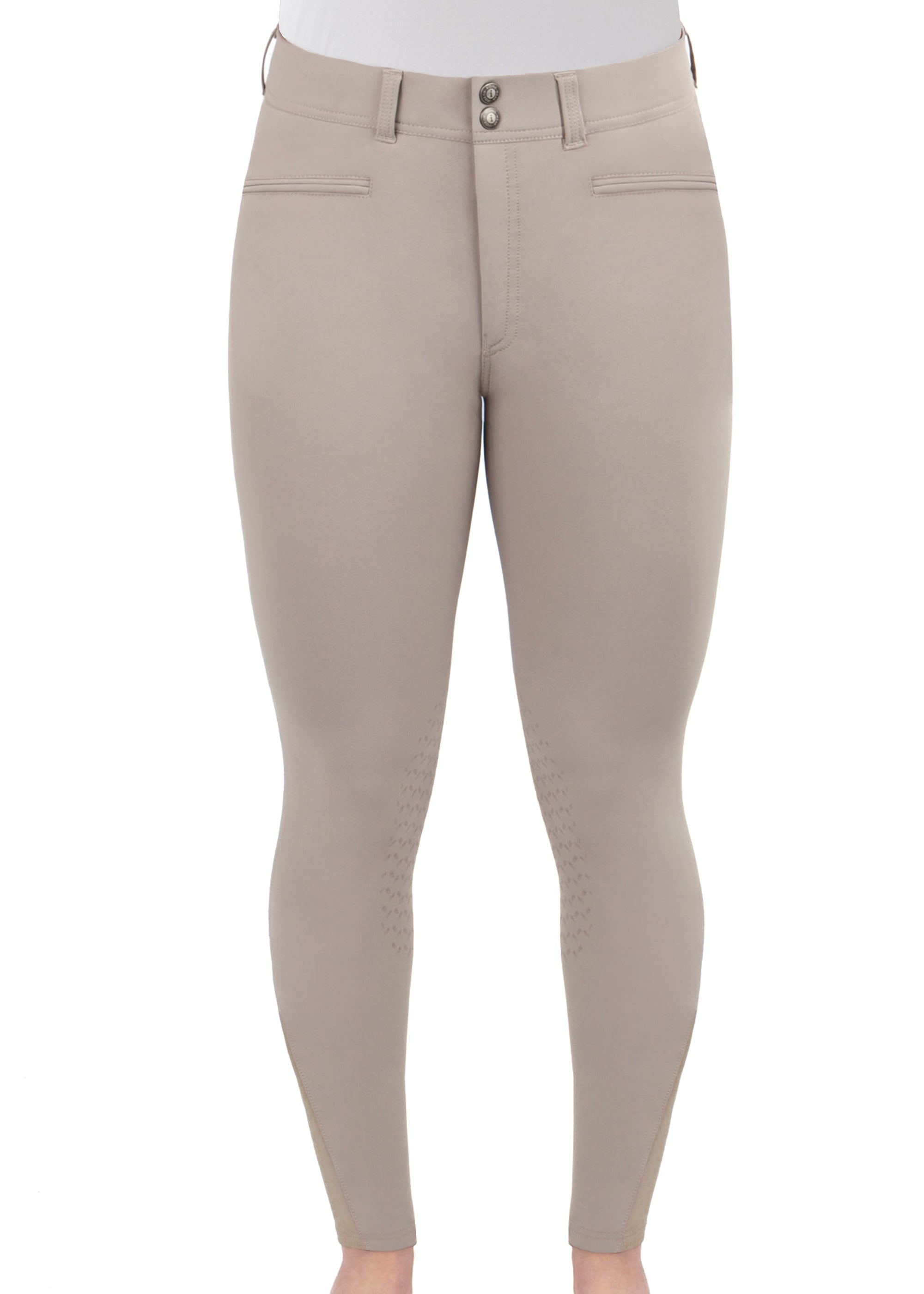 Traditional front zipper and belt loop styling is set off by modern contrast stitching. The horsehead tread silicone knee patches provide comfortable grip. Stretch panel bottoms let this breech fit smoothly inside boots. Mid rise, front-zip styling with belt loops, front pockets and snap-flap back pockets.