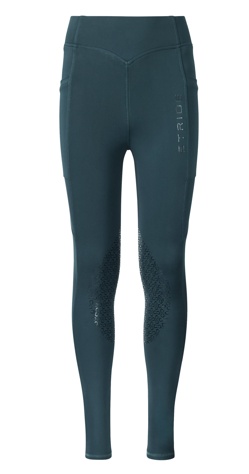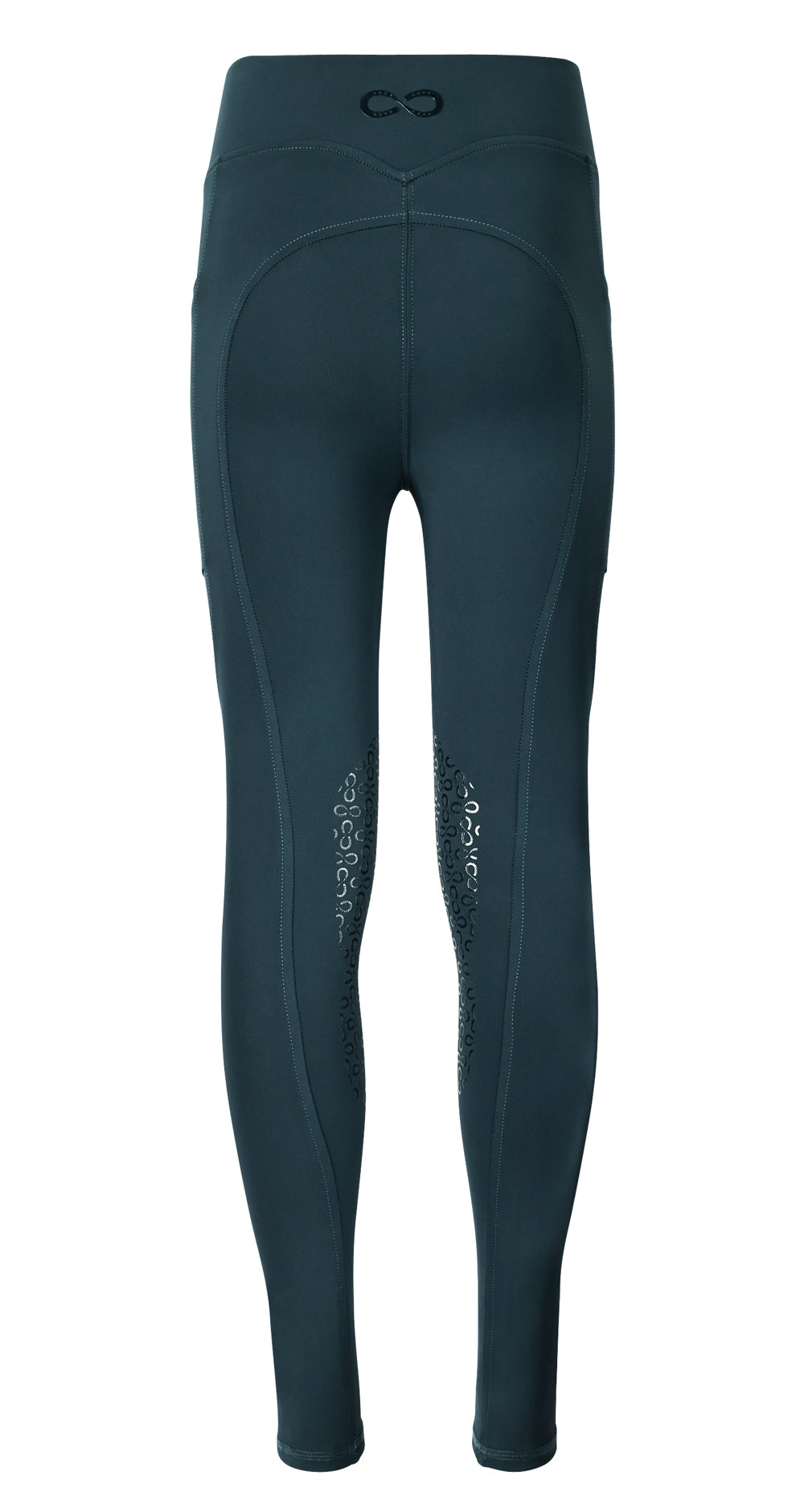 Stride Infinity logo in silicone print creates grippy knee patches. Elasticized self bottoms fit comfortably inside boots and half chaps. Generous thigh pockets hold the largest smartphone, tonal stitching and silicone print knee grips. Logos accent left thigh and center back.