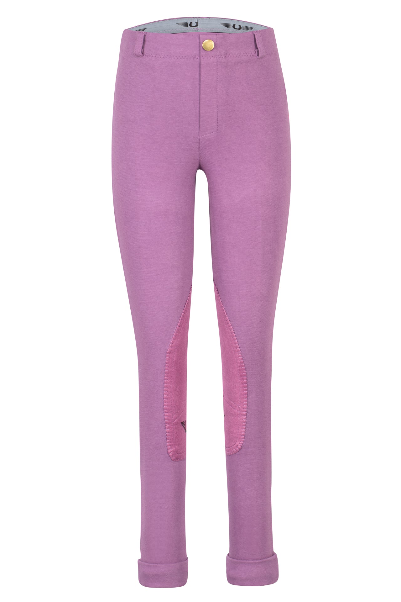 A jumping horse theme makes TuffRider® Cotton Embroidered Pull-On Jods fun to wear for schooling! This children’s pull-on jodhpur pant has detailed embroidery on the back and a faux-fly front. Made of soft, cotton/spandex fabric for comfort, it has a fashionable low rise, cuffed hems, and a waistband with belt loops. UltraGripp knee patches offer just the right grip.