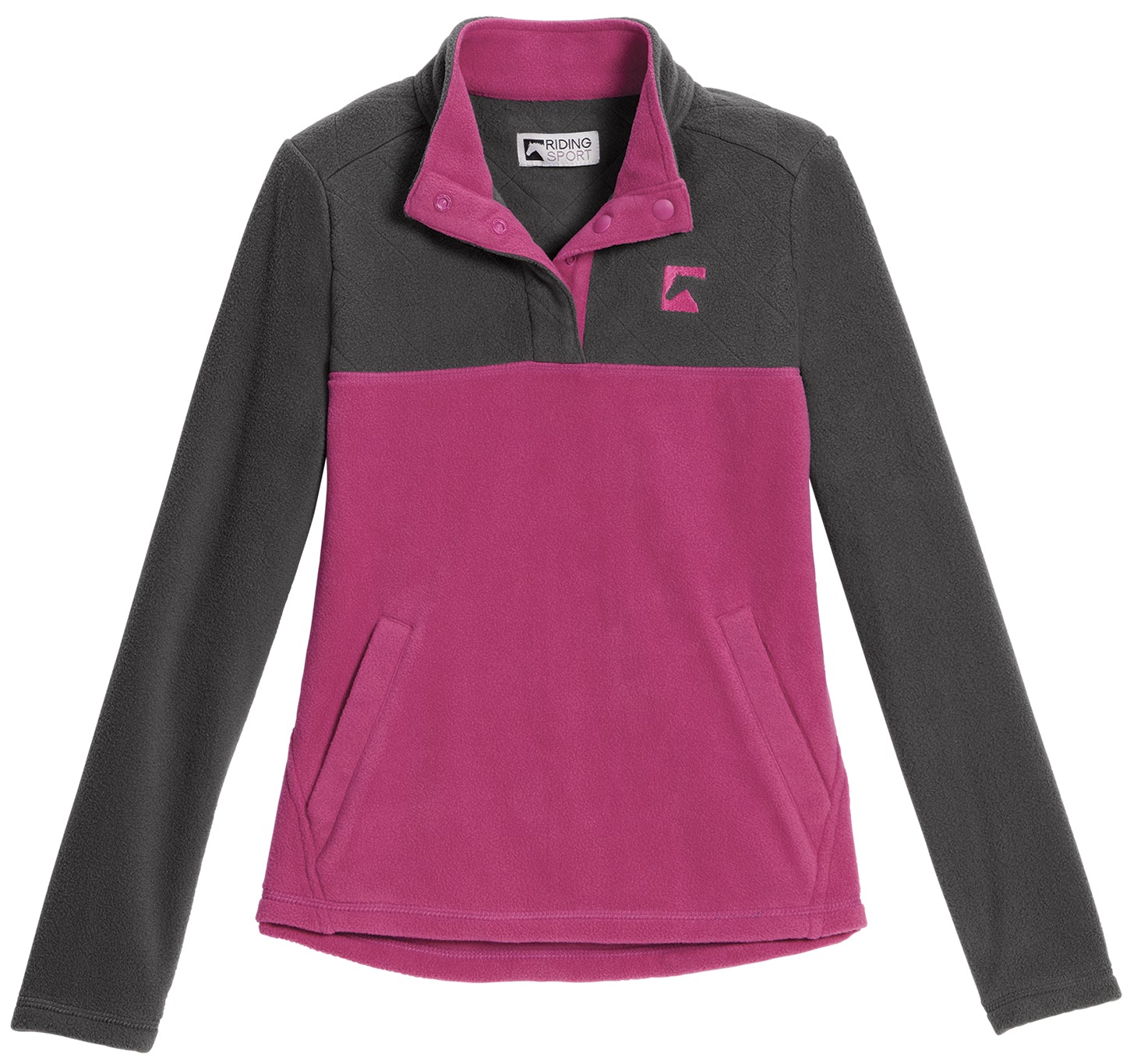 Toasty warmth. Styled with a relaxed fit and snap placket, this versatile pullover is made of insulating, medium-weight fleece with a quilted design on the top. Kangaroo pocket warms hands and stores horse treats. Slightly dropped back hem extends coverage while riding and grooming. Logo on chest.