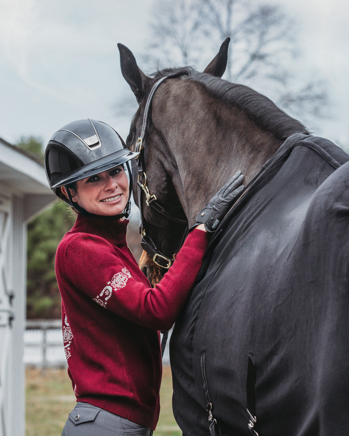 The Dancing Equestrian Ladies’ "Snowflake" Sweater has you covered in seasonal flair. This athletic-inspired, form fitting sweater has all the wonderful performance features of wool; wicking, breathable and temperature regulating. The unique combination of wool and nylon stretch knit blend will keep you moving freely all day long. Quarter zip with metal branded pull.