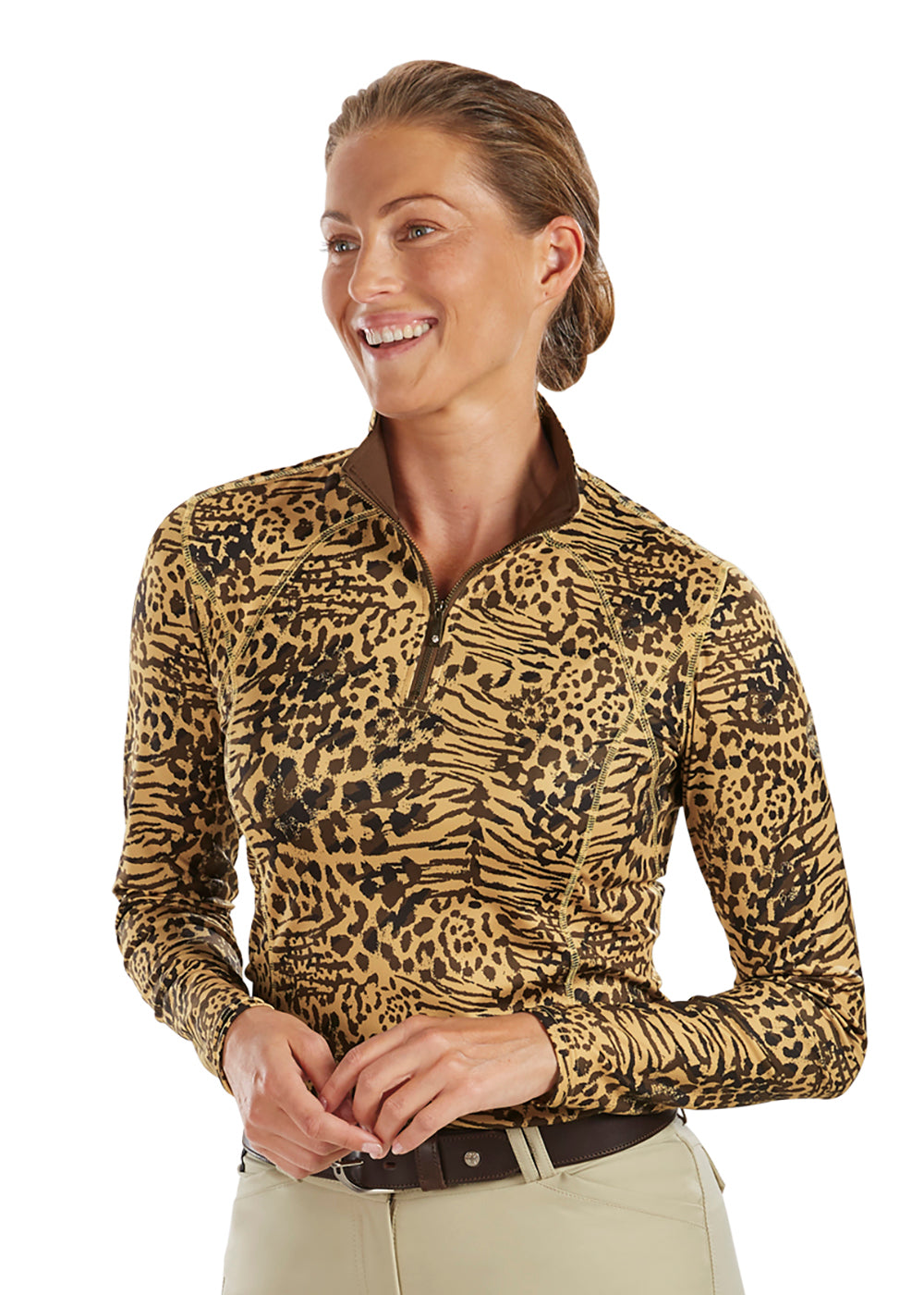 Explore your wild side in the DS Ladies’ Meredith Print Quarter-Zip Shirt. Soft, moisture-wicking LuxTech fabric in mixed zebra and leopard prints keeps you warm but remains breathable. Attractive as a base layer or as a shirt on its own, Meredith has a slightly shiny zipper with a jewelry-inspired pull embedded with a crystal. A slightly dropped hem ensures coverage as you ride. Seams are figure-flattering, yet the fabric doesn’t cling.