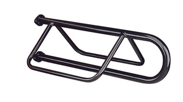 The English Saddle Rack makes a practical accessory for the tack room or trailer. This powder coated tubular steel rack mounts securely to any wall. Its modified design accommodates most all-purpose, close contact and dressage saddles. Side panels help maintain the saddle's shape, while the bottom rung provides a spot for hanging a saddle pad. 8 1/2"H x 15"W x 24"D.