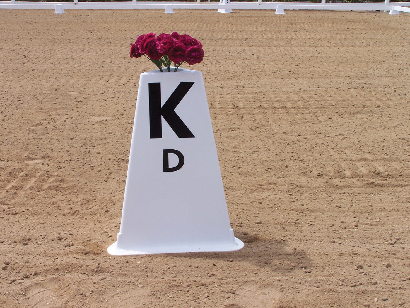 Burlingham Sports Tower Letters are designed to withstand even the windiest conditions. This set of eight dressage letters is comprised of exceptionally stable cones. The appropriate letters and centerline letters are painted on at a height that allows them to be seen from a distance over all types of dressage arena rails.