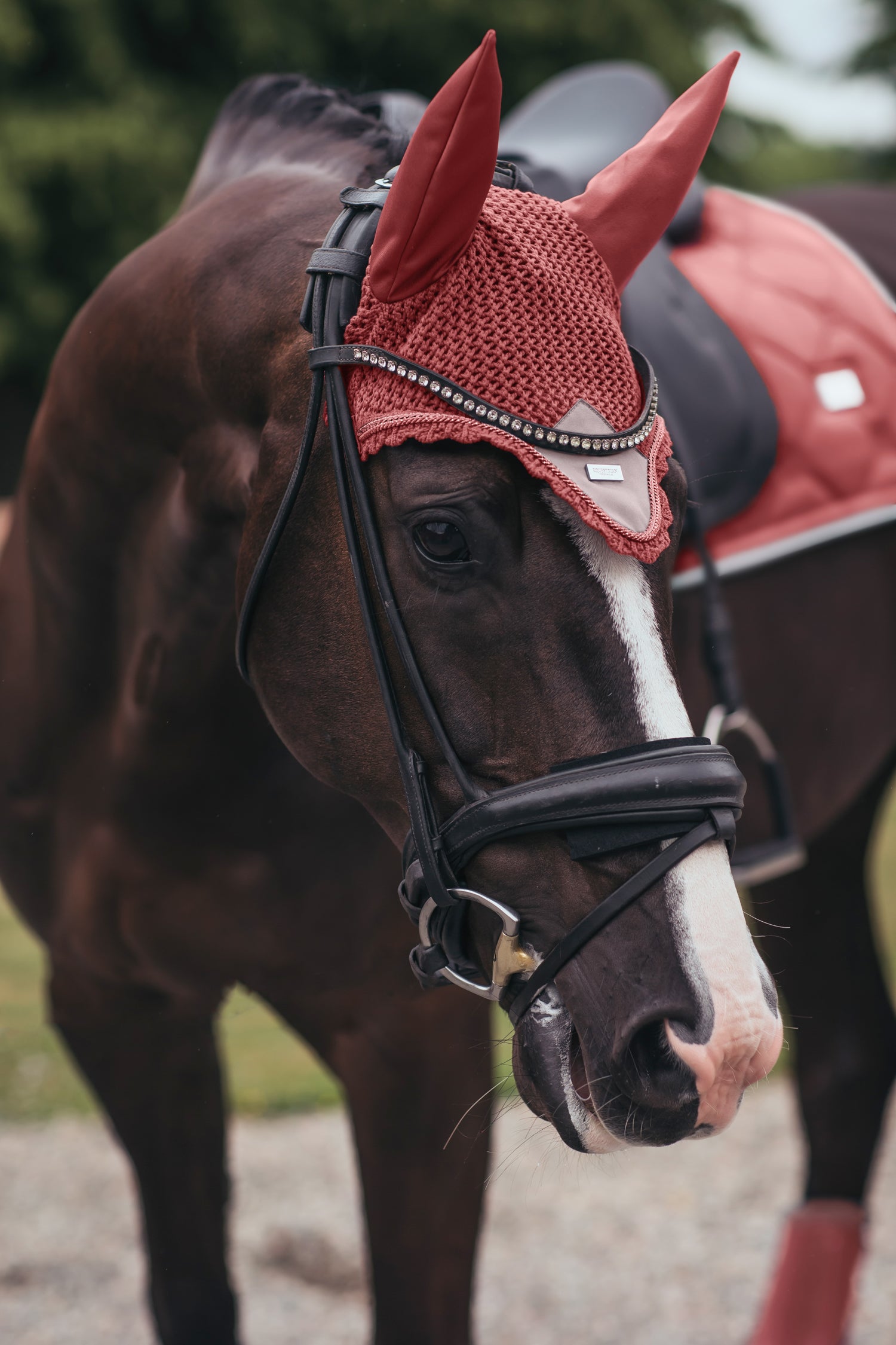 The Equestrian Stockholm Classic Ear Bonnet is a luxurious design offering protection against insects and fostering focused rides. It pairs a breathable crocheted body and stretchy cloth ear covers. Decorated with a tone-on-tone satin patch, tone-on-tone metallic piping and an Equestrian Stockholm badge.