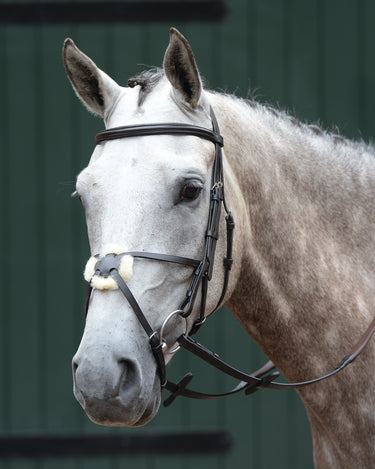 A great choice for competing in low level show jumping, cross country or for everyday use, this Collegiate® Essential Padded Raised Figure-8 Bridle has a classic look in quality brown leather. It features a traditional ring style figure-8 nose with padded center piece and padded brow. Rubber reins are included.