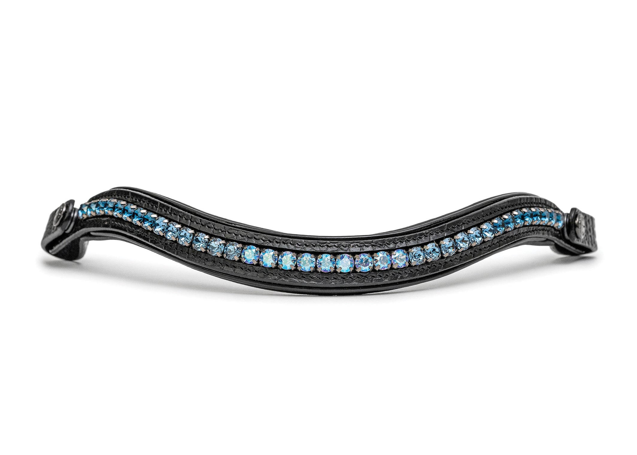 The ultimate in sophistication and innovation, The Halter Ego® Doc Marten Snaffle Bridle with a new invisible, removable flash. The black snaffle bridle is simply stunning and features elegant black crocodile printed leather on the anatomical noseband and browband. Plush black Nappa padding with black patent piping and a scintillating ombre crystal design adorn the browband. The anatomical crownpiece and buttery soft padding on the noseband provide ultimate comfort for your horse. Includes luxury rubber grip lined reins with hand stops. Full size reins are 56" long x 1/2" wide.