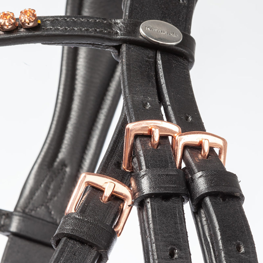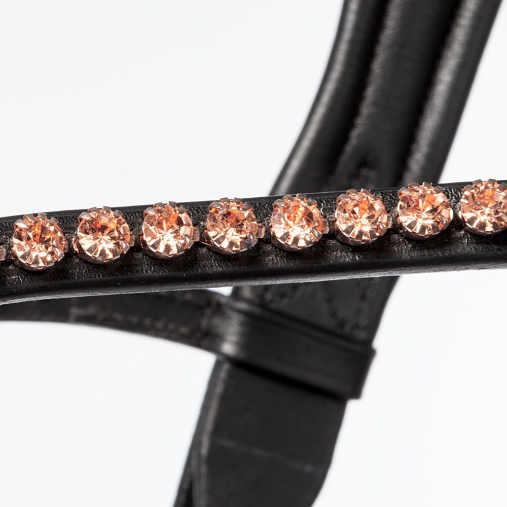 Trendy riders and their horses appreciate the eye-catching style of the Kavalkade Rose Bridle. Rose-colored crystals sparkle on the slender browband, and rose-gold colored fittings shimmer throughout.