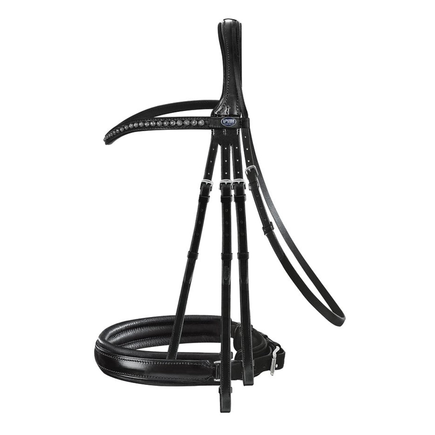 The Fortuna Double Bridle is crafted from Passier’s finest bridle leather. It’s equipped with a softly lined Caveson Special and a waved browband with premium anthracite crystals. Comes with two sets of reins. Snaffle rein is leather with rubber on the inner aspect and hook stud closures. Curb rein is leather with hook-stud closures.