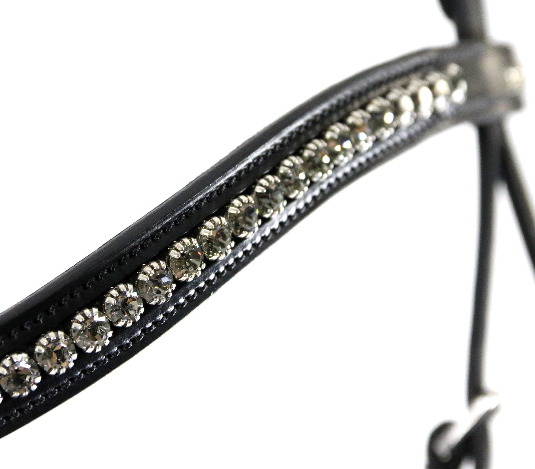 - Wide, curved browband that avoids pinching in the areas of eyes and ears while offering a stylish look with rounded clear crystals inset along its center.