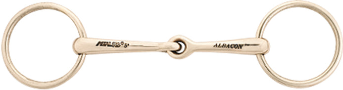 The AlBaCon™ Bradoon Bit is made from copper enhanced German Silver to help stimulate salivation and encourage bit acceptance. The high copper formula also helps prevent dry mouth, yet retains the appearance and durability of German Silver. 13mm mouthpiece with 55mm rings.