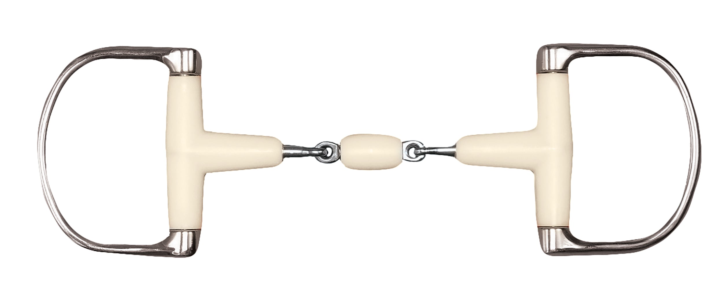 The Happy Mouth Bits® Pony Double-Jointed Racing Dee features a mouthpiece covered in soft, flexible, yet extremely durable, apple-scented plastic. This mouth material encourages bit acceptance and softness. Core and cheeks are stainless steel. Slightly smaller dee cheeks than those in a king dee, they still provide some slight lateral guidance and help prevent the bit from sliding sideways in the horse's mouth.