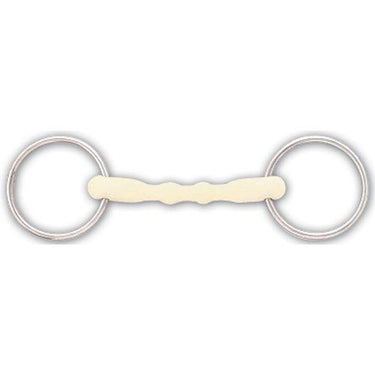 The Happy Mouth Bits® Shaped Mullen Mouth Loose Ring Bit is covered with a soft, flexible, yet extremely durable, apple-scented plastic. This mouthpiece material encourages bit acceptance and softness. The shaped mullen mouthpiece has an inner core of twisted wire for more flexibility. It is a mild bit design as it distributes pressure across the tongue instead of on the sensitive bars of the mouth. Stainless steel rings.