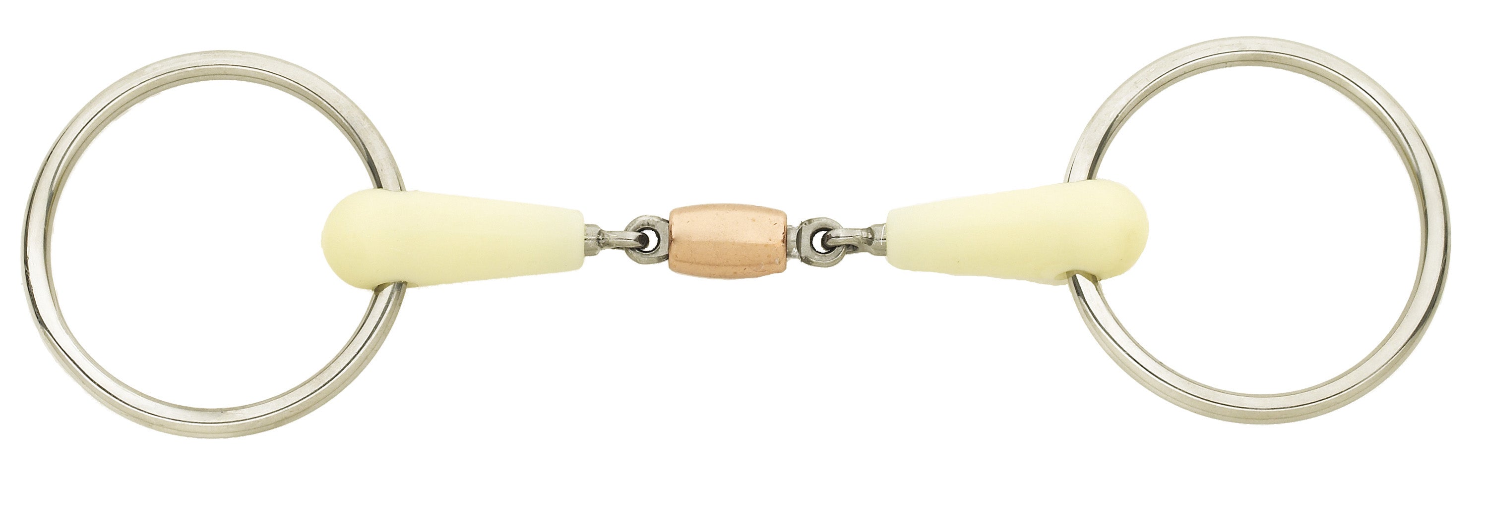 For a new twist on a popular favorite, the Happy Mouth Bits® Copper Roller Loose Ring Bit has a center roller made of 99.9% pure copper to encourage salivation and a soft mouth. The combination of the soft, apple-scented plastic mouthpiece and the copper roller make acceptance of the bit much easier for many horses. Stainless steel cheeks.